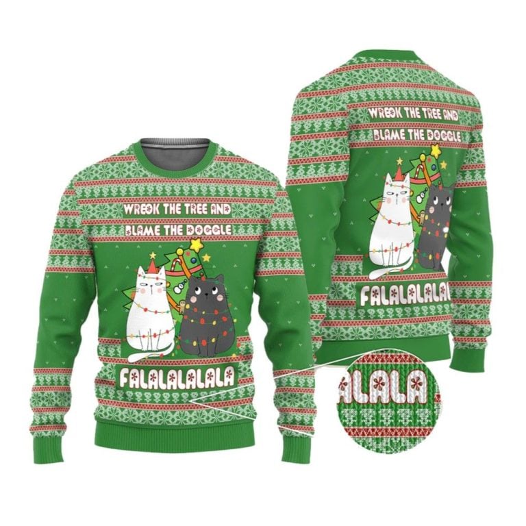 Bring playful chaos to your holiday celebrations with the 2025 Christmas Cat “Wreck The Tree And Blame The Doggle” Ugly Christmas Sweater. Featuring a mischievous cat causing tree havoc, this sweater blends humor, festive charm, and cozy comfort — perfect for cat lovers and fans of quirky holiday apparel.