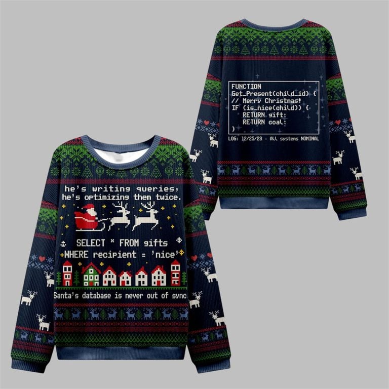 Bring some tech humor to the holidays with the 2025 Christmas “Database Never Out of Sync” Ugly Christmas Sweater — the perfect blend of nerdy wit and seasonal cheer. Designed for coders, IT pros, and database lovers, this sweater celebrates perfect synchronization and cozy comfort in true festive style.