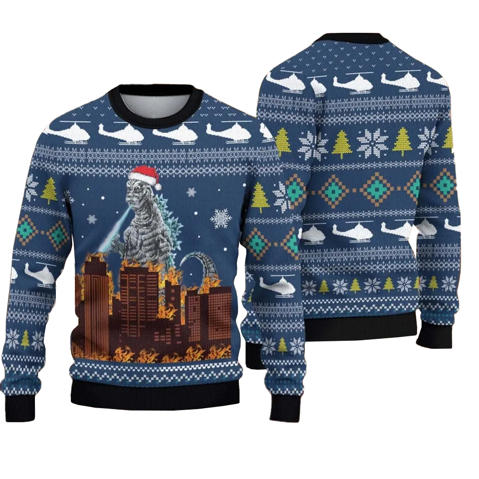 Crafted from soft, cozy knit fabric, this sweater will keep you warm and comfy whether you’re facing the cold winter night or simply lounging in front of the TV. The classic unisex fit ensures you can move freely, while the Godzilla-inspired design adds a dash of wild fun to your look. It’s perfect for those who want to be both cozy and monstrously cool this Christmas.