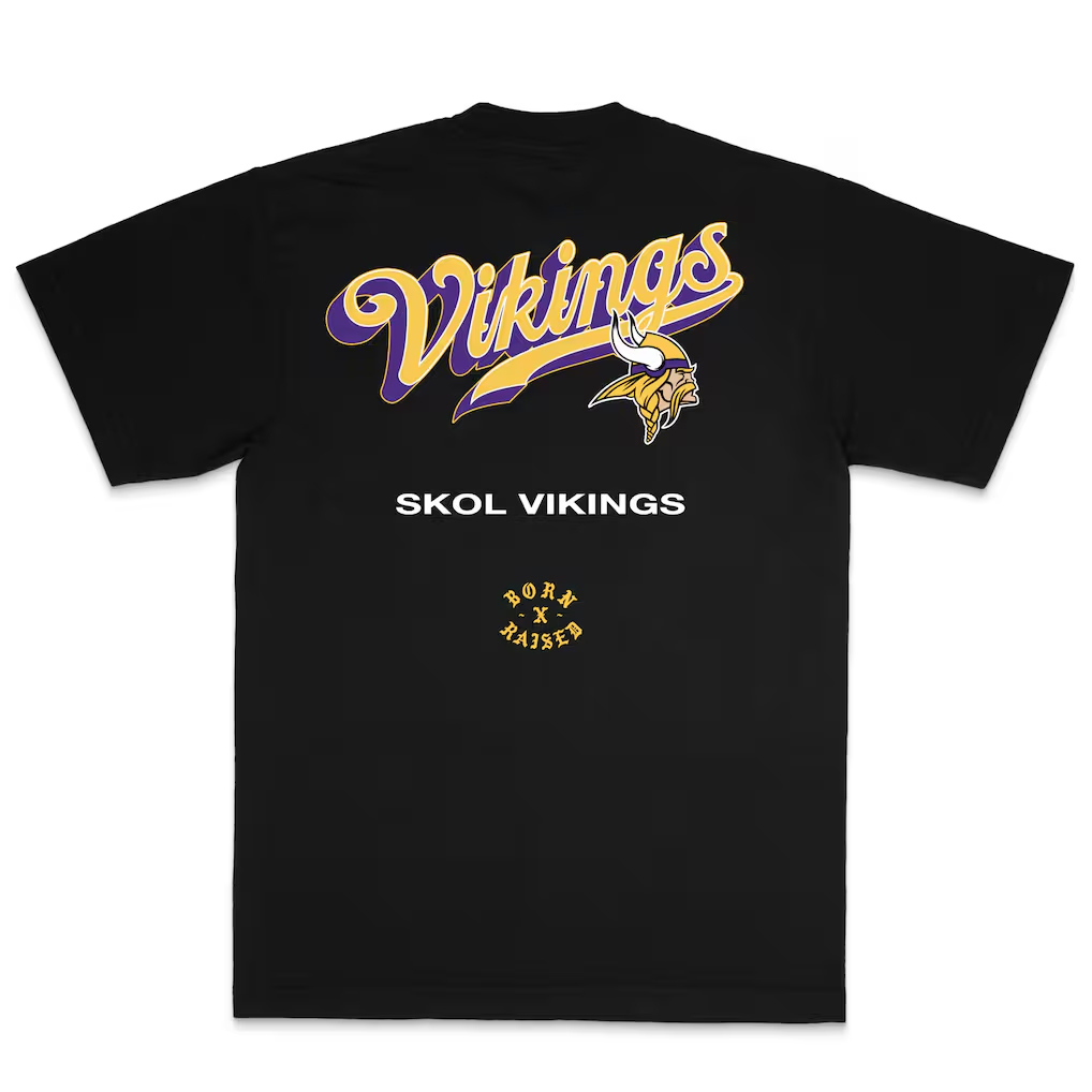 Graphic: Bold “Born x Raised” script with Minnesota Vikings branding