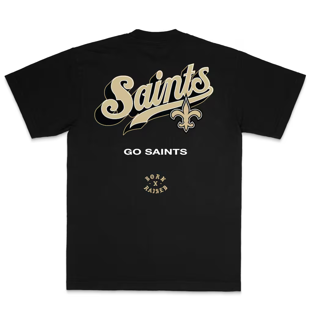 Graphic: Bold “Born x Raised” script with New Orleans Saints branding