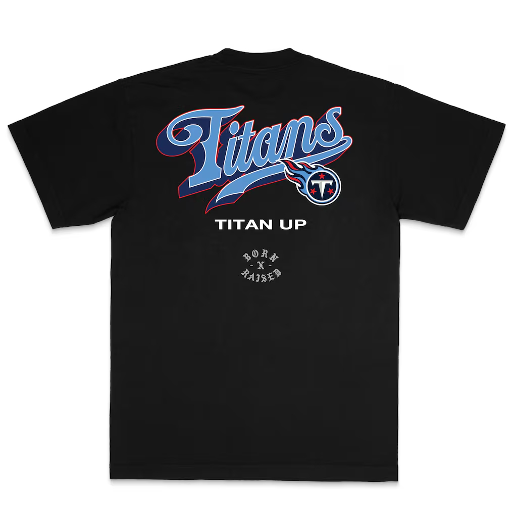 Graphic: Bold “Born x Raised” script with Tennessee Titans branding
