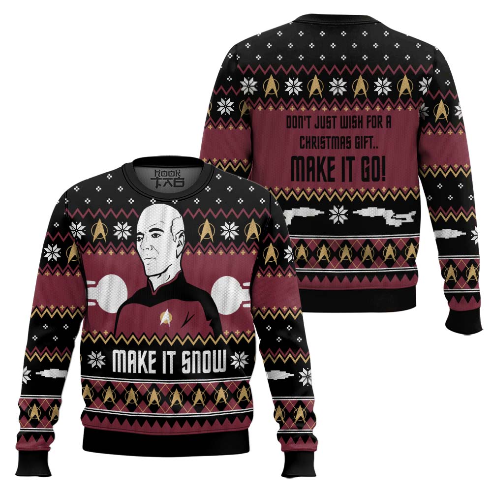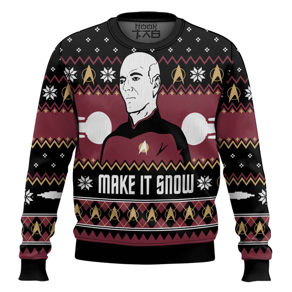 3D Make It Snow With Captian Jean-Luc Picard Christmas Custom Ugly Sweater This Curvy Glams exclusive Ugly Christmas Sweater design is guaranteed to get attention and get the party started. It?s sure to be your best holiday purchase yet! Material: Our sweaters are made from high-quality polyester wool blend, which keeps you warm and never crack, peel or flake. Features a specialty high definition heat-dye application that ensures long lasting color vibrancy even after machine washing. All our sweaters are handcrafted, cut and sewn one-by-one for the highest quality standard Sizing: Unisex fit. Click on size chart button above add to cart button for addiditional sizing information Care Instructions: Regular handwash; Machine wash (max 40? or 105F); Do not bleach; Iron on a low heat;Tumble dry.