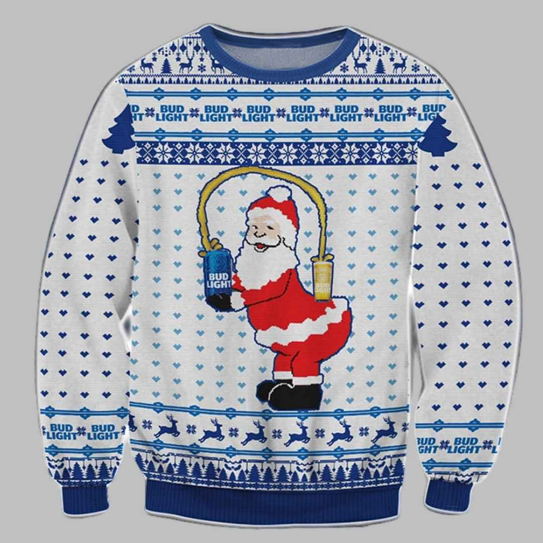 This unique Christmas sweater features a humorous design with Santa Claus taking a break from his busy schedule to enjoy a can of Bud Light. He’s depicted in his classic red suit, but instead of holding a sack of toys, he’s holding a Bud Light can and even using a can as a playful jump rope. The iconic Bud Light logo and blue and white color scheme are prominently featured throughout the design, along with festive elements like snowflakes, Christmas trees, and reindeer.