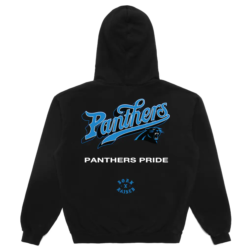 Graphic: Bold “Born x Raised” script with Carolina Panthers branding
