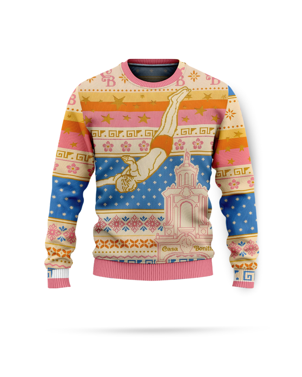 Featuring classic Casa Bonita diving imagery integrated into Christmas-themed designs, this sweater delivers humor and nostalgia in one bold package.