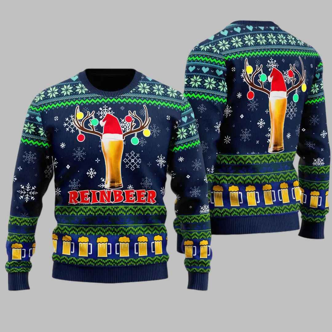 Crafted from quality materials, this sweater offers both comfort and durability. The design features a whimsical reindeer with antlers made of beer glasses, topped with a festive Santa hat. The “REINBEER” inscription adds a playful touch, while the intricate patterns and vibrant colors create a truly festive look. This sweater is perfect for both casual and festive occasions, ensuring you stay cozy and stylish throughout the holiday season.