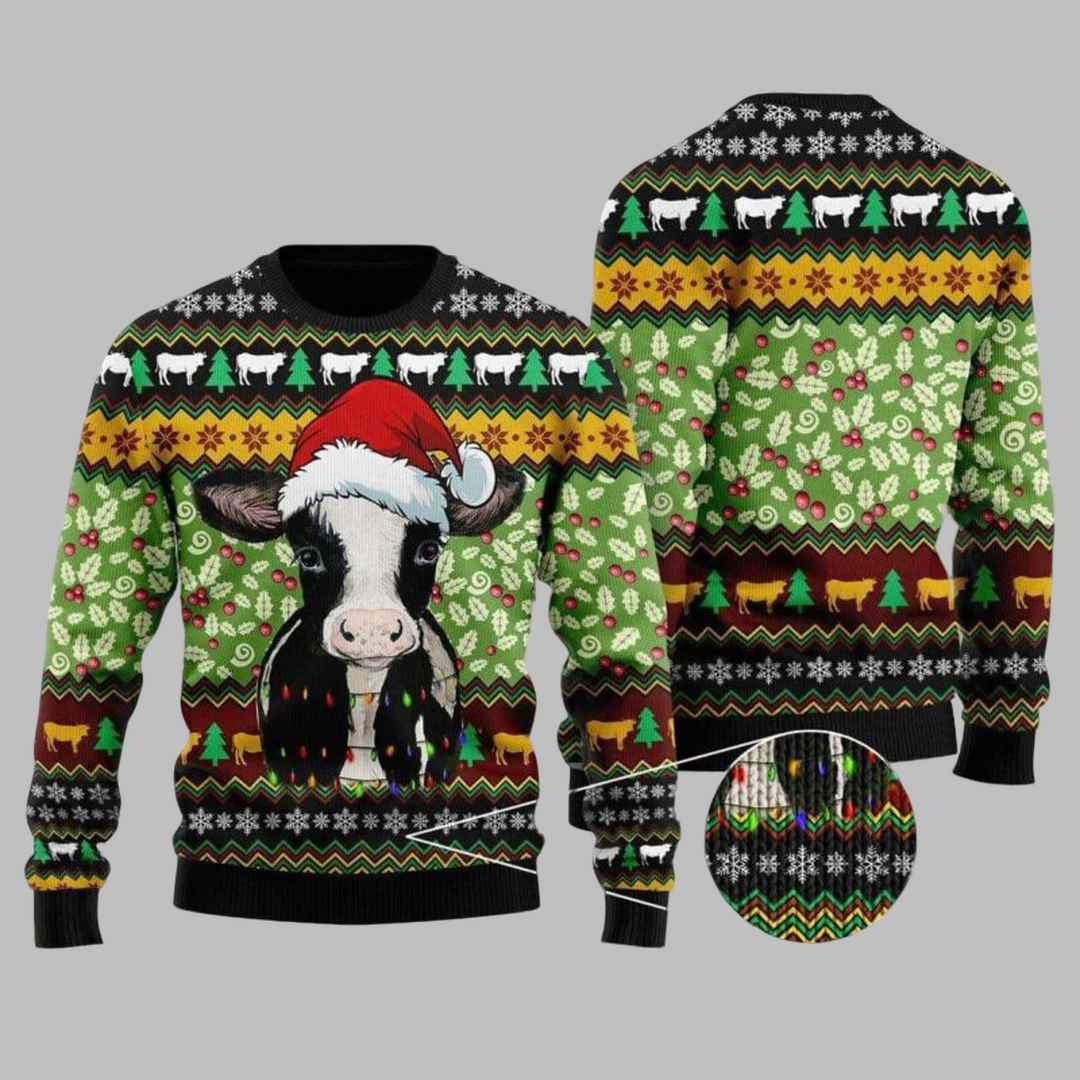 This adorable sweater features a charming cow sporting a Santa hat and a string of colorful Christmas lights. The design is set against a backdrop of festive green, black, and gold, with traditional patterns like snowflakes, holly, and stylized cows. The combination of colors and patterns creates a cheerful and festive aesthetic that’s sure to stand out at any holiday gathering.
