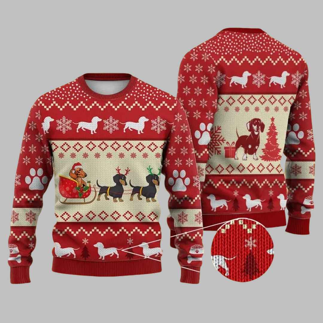 This eye-catching Christmas sweater features a merry scene of Santa Claus being pulled in his sleigh by a team of adorable dachshunds, complete with reindeer antlers! The sweater also incorporates festive Christmas patterns with snowflakes, paw prints, and more dachshund silhouettes.