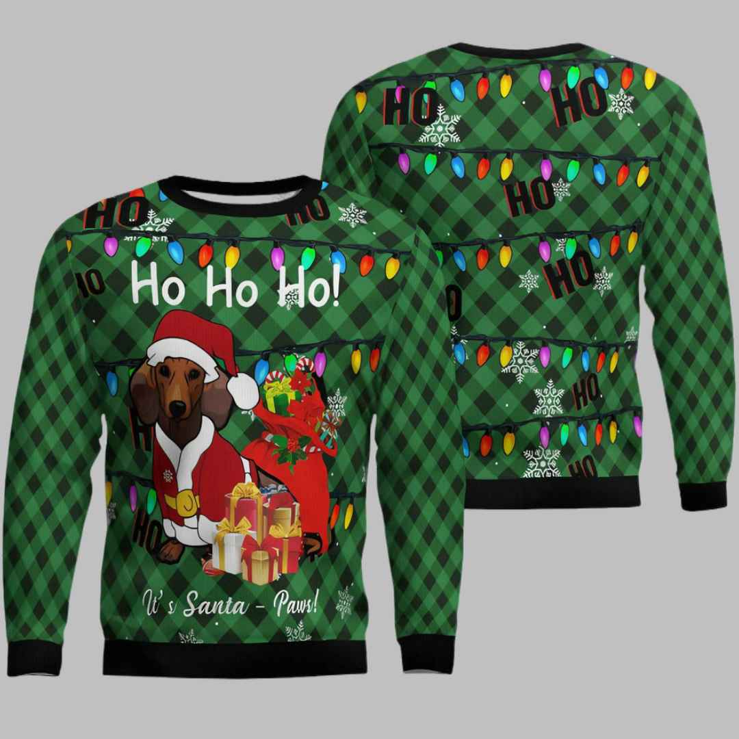 Featuring a charming dachshund dressed as Santa Claus, complete with a Santa hat and a sack full of gifts, the Dachshund Santa Paws Ugly Christmas Sweater is guaranteed to bring smiles and spread holiday cheer. The playful design is complemented by festive “Ho Ho Ho!” lettering and twinkling Christmas lights, making it a truly eye-catching piece.
