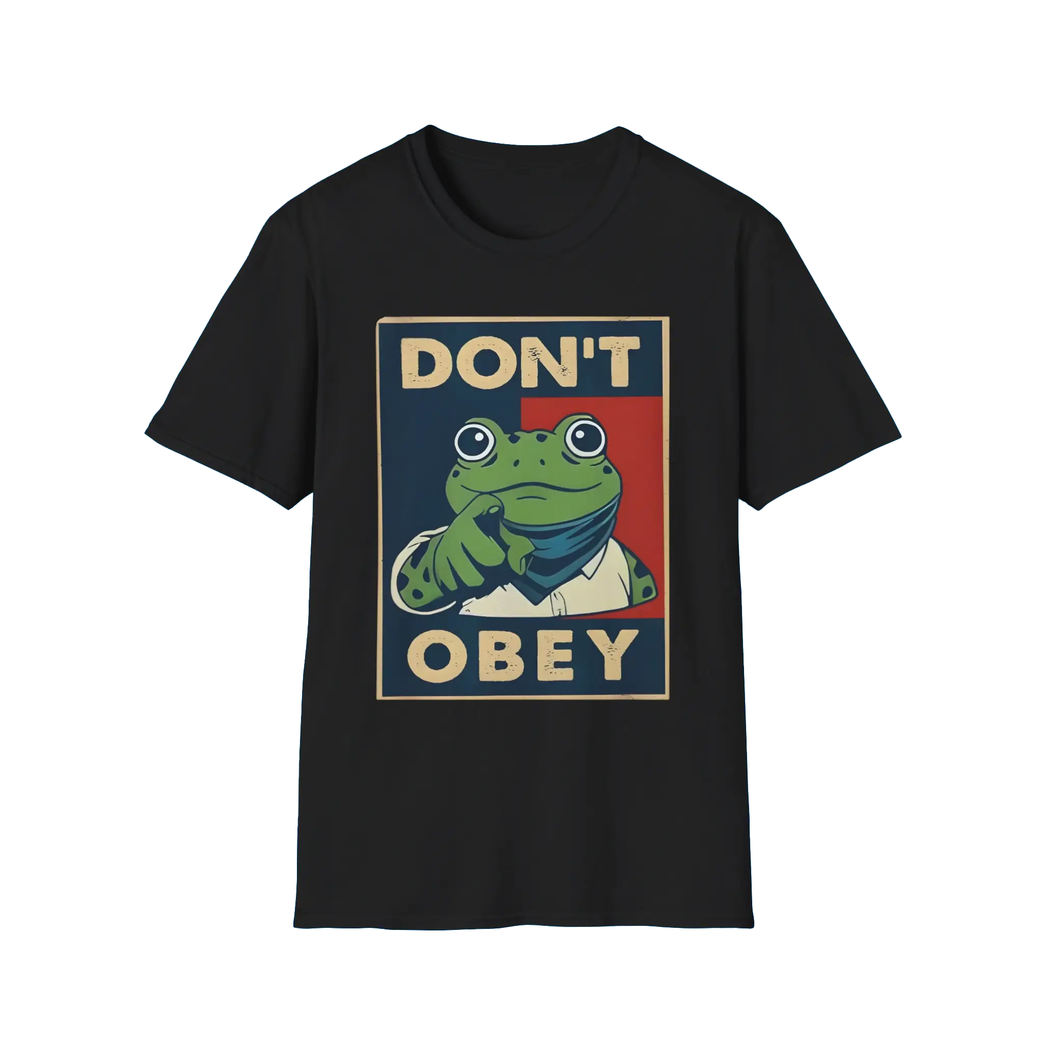 Because sometimes silence isn’t golden — it’s boring. With its bold “Don’t Obey” statement and unforgettable frog graphic, this shirt captures the spirit of free thought, individuality, and street-smart sarcasm all in one iconic design.