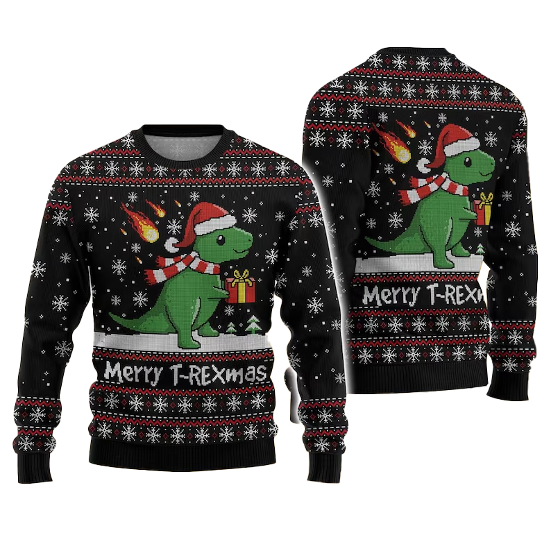 Perfect for dinosaur fans and lovers of quirky Christmas fashion alike, this design adds a lighthearted, cheerful twist to traditional ugly sweaters. It’s fun, memorable, and full of personality.