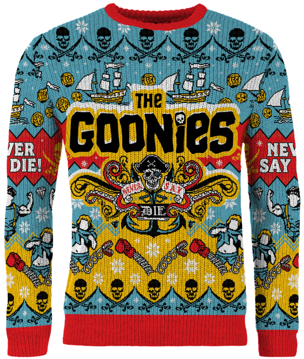 Channeling the spirit of The Goonies and the holiday season, this sweater is a perfect way to show off your love for the movie while embracing the Christmas cheer. With a playful twist on the iconic “Goonies Never Say Die” phrase, it’s ideal for those who want to celebrate the holidays in a way that’s as adventurous as a treasure hunt.