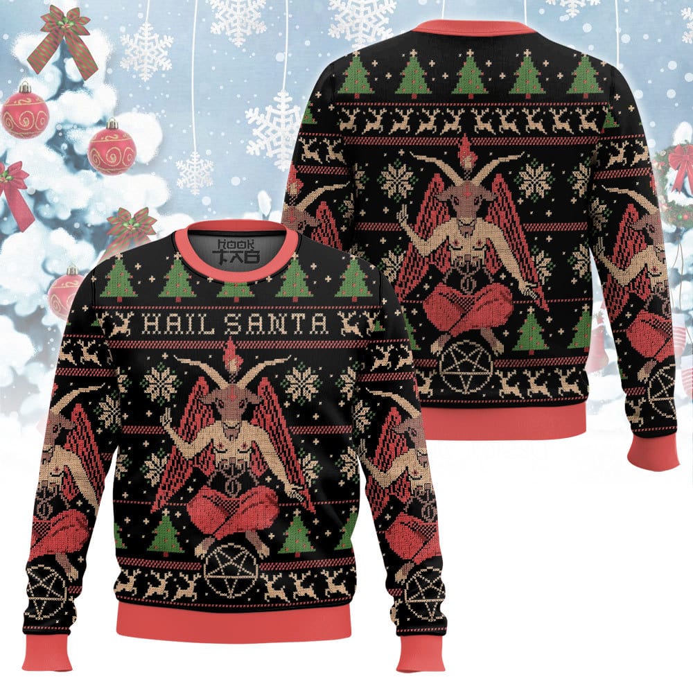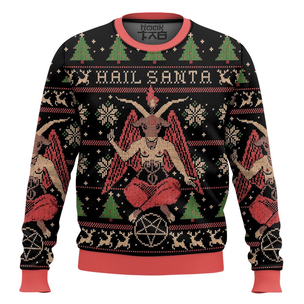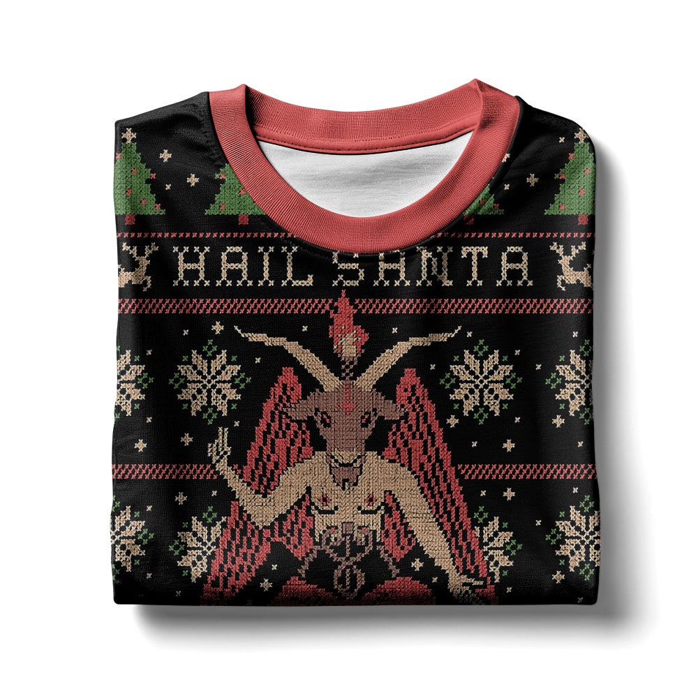 Hail Santa Satan Claus Ugly Sweater This Curvy Glams exclusive Ugly Christmas Sweater design is guaranteed to get attention and get the party started. It?s sure to be your best holiday purchase yet! Material: Our sweaters are made from high-quality polyester wool blend, which keeps you warm and never crack, peel or flake. Features a specialty high definition heat-dye application that ensures long lasting color vibrancy even after machine washing. All our sweaters are handcrafted, cut and sewn one-by-one for the highest quality standard Sizing: Unisex fit. Click on size chart button above add to cart button for addiditional sizing information Care Instructions: Regular handwash; Machine wash (max 40? or 105F); Do not bleach; Iron on a low heat;Tumble dry.