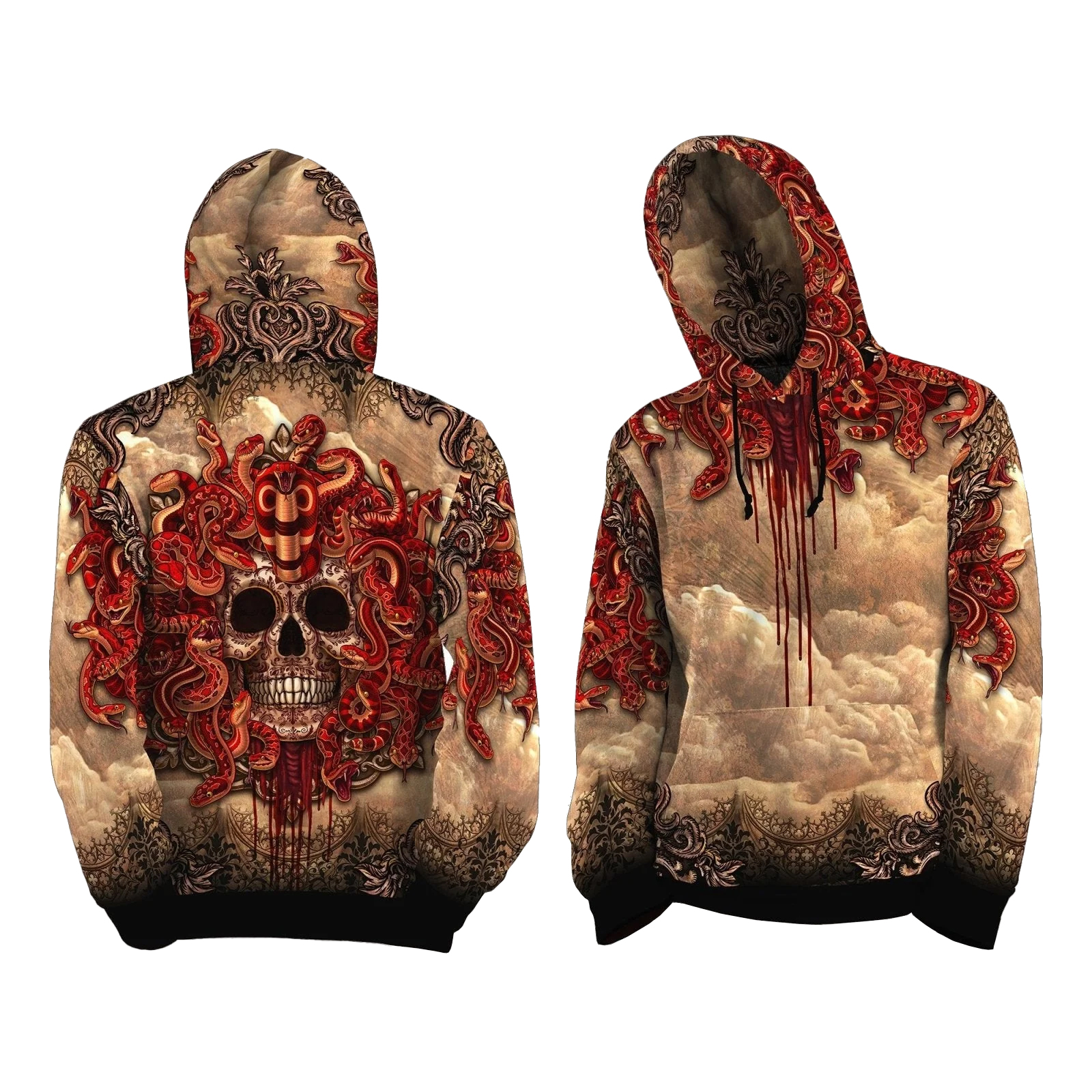 The bold, grunge-inspired Medusa skull graphic is the perfect mix of eerie and cool. Whether you’re heading to a Halloween party or just looking to add some edge to your wardrobe, this hoodie is an unforgettable choice.