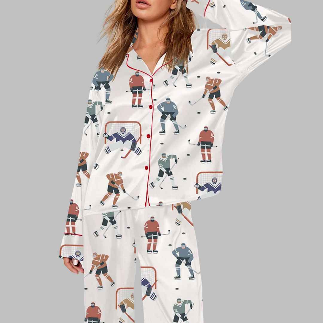 The Hockey Player Pajama Set features a vibrant and dynamic print of hockey players in action, complete with goalposts, pucks, and team colors. The design captures the energy and spirit of the sport while adding a fun and unique touch to your loungewear collection.