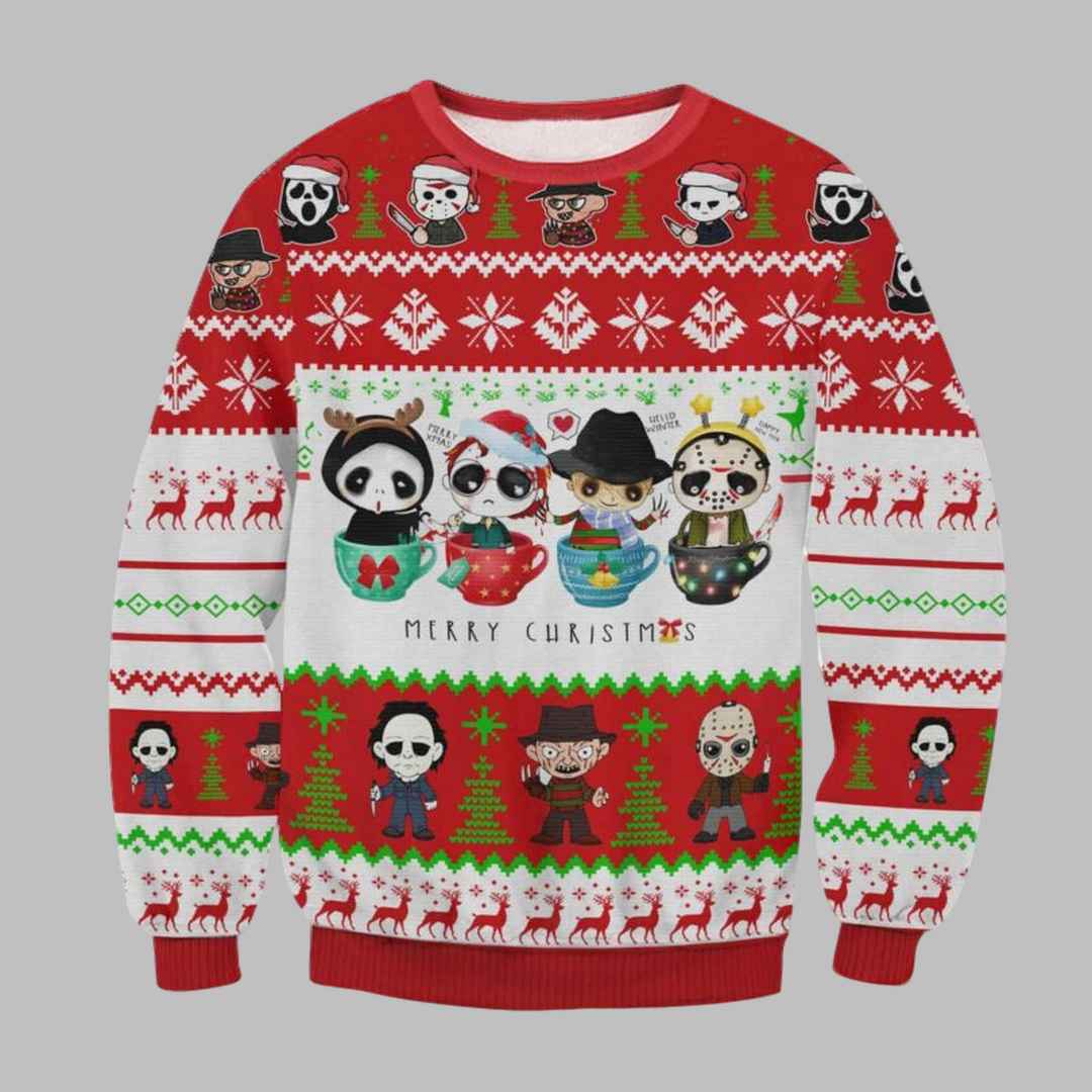 This eye-catching sweater features an adorable yet terrifying design. Your favorite horror movie icons ? Freddy Krueger, Jason Voorhees, Michael Myers, Ghostface, and Leatherface ? are reimagined as cute chibi characters nestled in festive Christmas mugs. The design is set against a classic Christmas sweater backdrop of red, white, and green with traditional patterns like snowflakes, reindeer, and Christmas trees. The bold “Merry Christmas” message adds a touch of ironic holiday cheer.