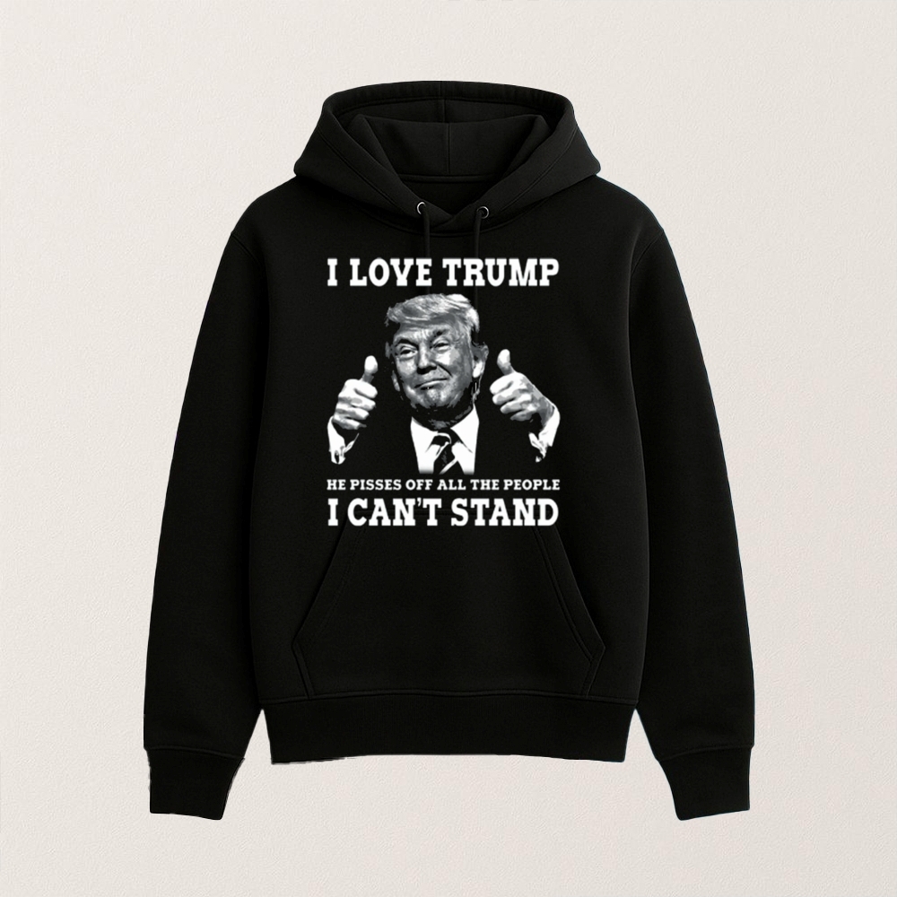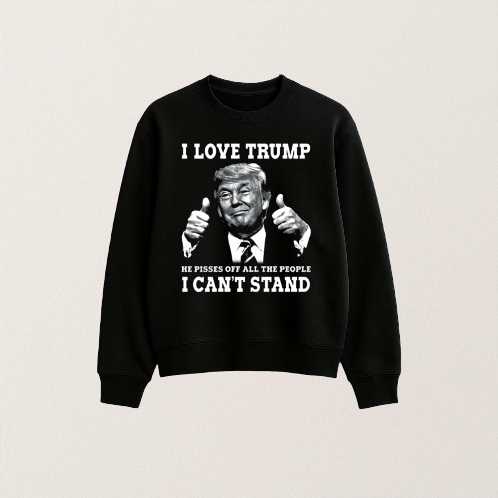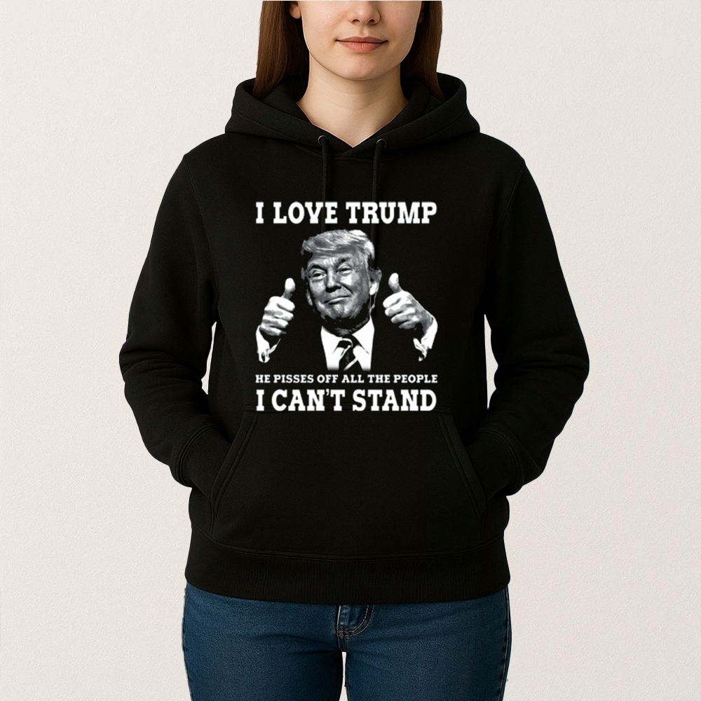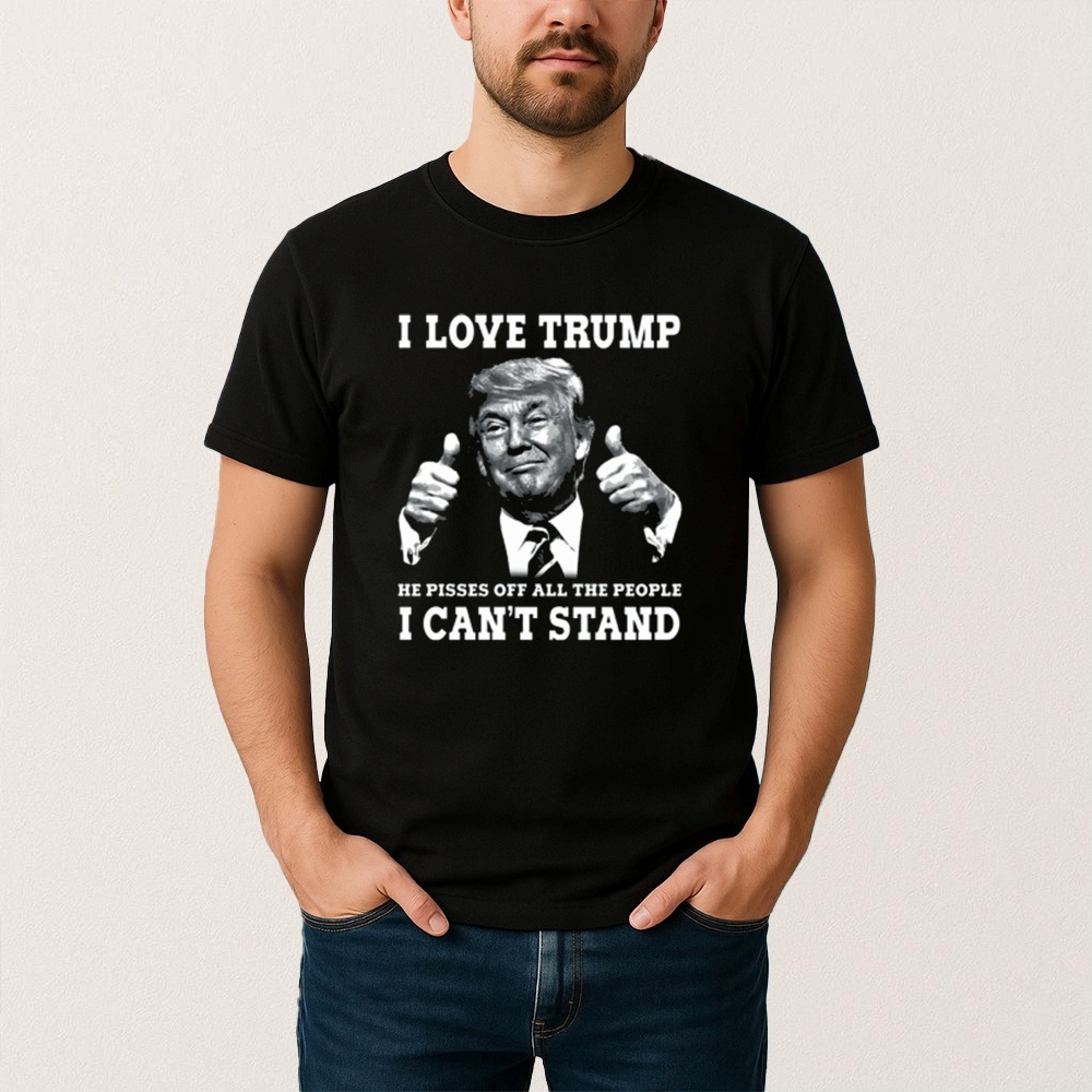 The “I Love Trump Because He Pisses Off The People” T-shirt exemplifies how clothing can serve as a provocative form of expression, sparking conversation and eliciting strong reactions. This apparel not only communicates the wearer’s political stance but also taps into the broader cultural and social dynamics, challenging the status quo and engaging with the divisive nature of contemporary politics. By wearing such a shirt, individuals align themselves with a community that values boldness and defiance, using fashion as a tool to assert identity and influence discourse.