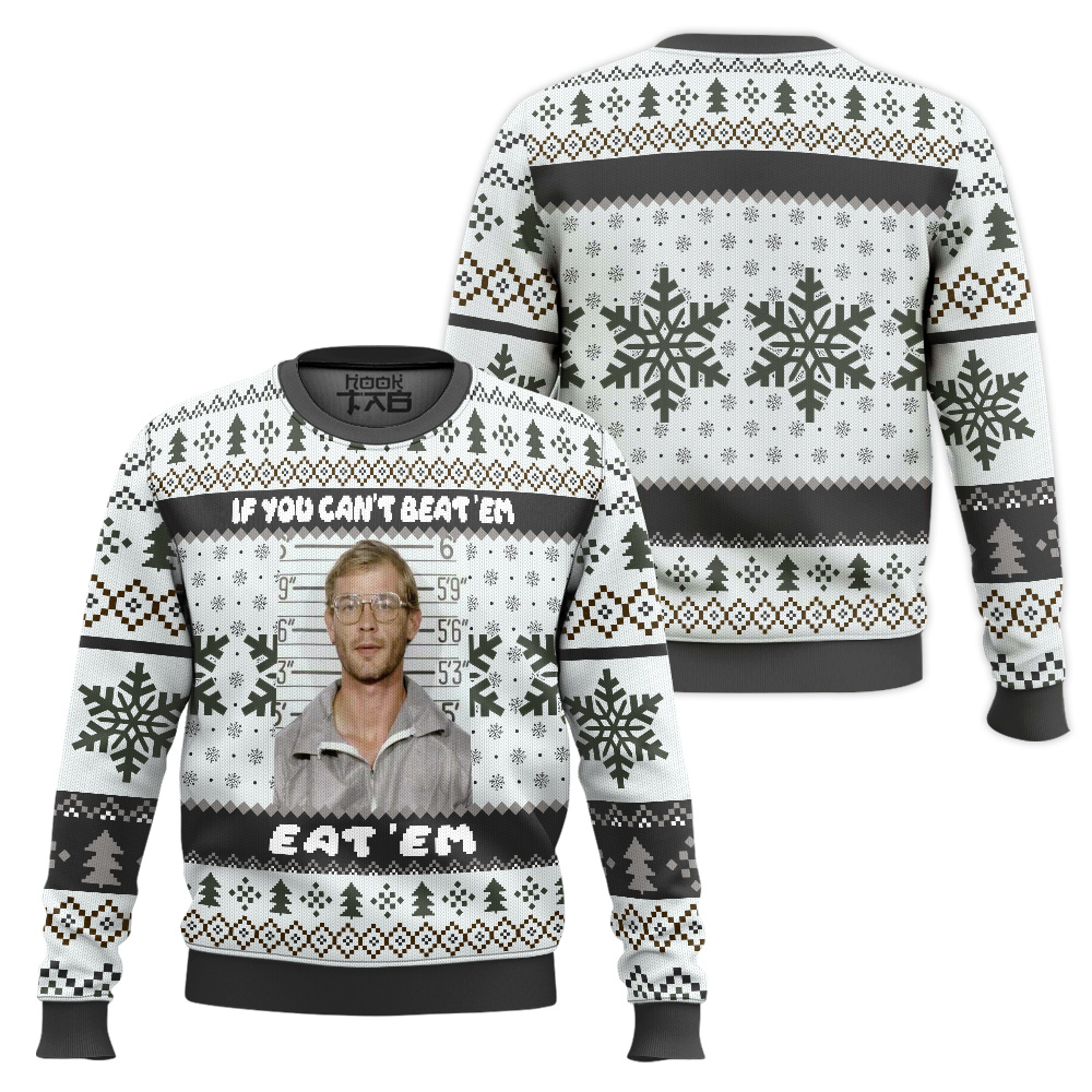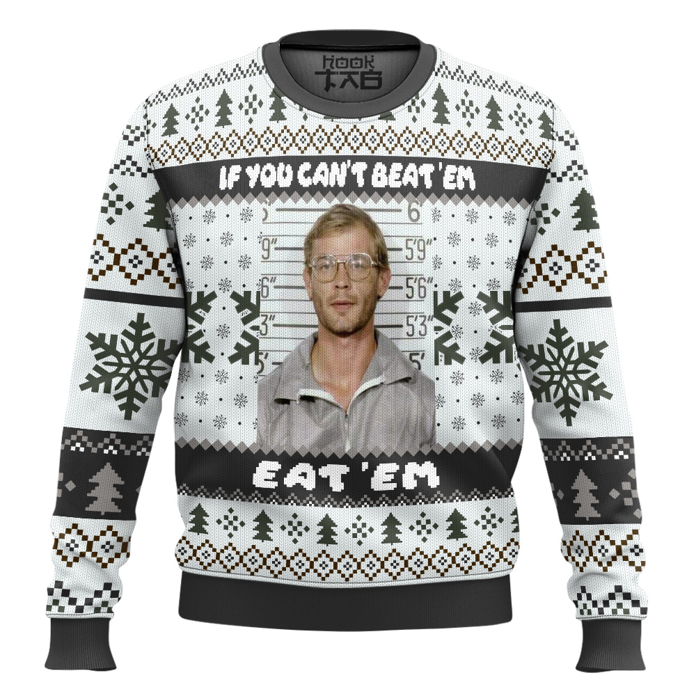 Jeffrey Dahmer Funny Serial Killer If You Can?t Beat ?Em Eat ?Em Ugly Christmas Sweater This Curvy Glams exclusive Ugly Christmas Sweater design is guaranteed to get attention and get the party started. It?s sure to be your best holiday purchase yet! Material: Our sweaters are made from high-quality polyester wool blend, which keeps you warm and never crack, peel or flake. Features a specialty high definition heat-dye application that ensures long lasting color vibrancy even after machine washing. All our sweaters are handcrafted, cut and sewn one-by-one for the highest quality standard Sizing: Unisex fit. Click on size chart button above add to cart button for addiditional sizing information Care Instructions: Regular handwash; Machine wash (max 40? or 105F); Do not bleach; Iron on a low heat;Tumble dry.