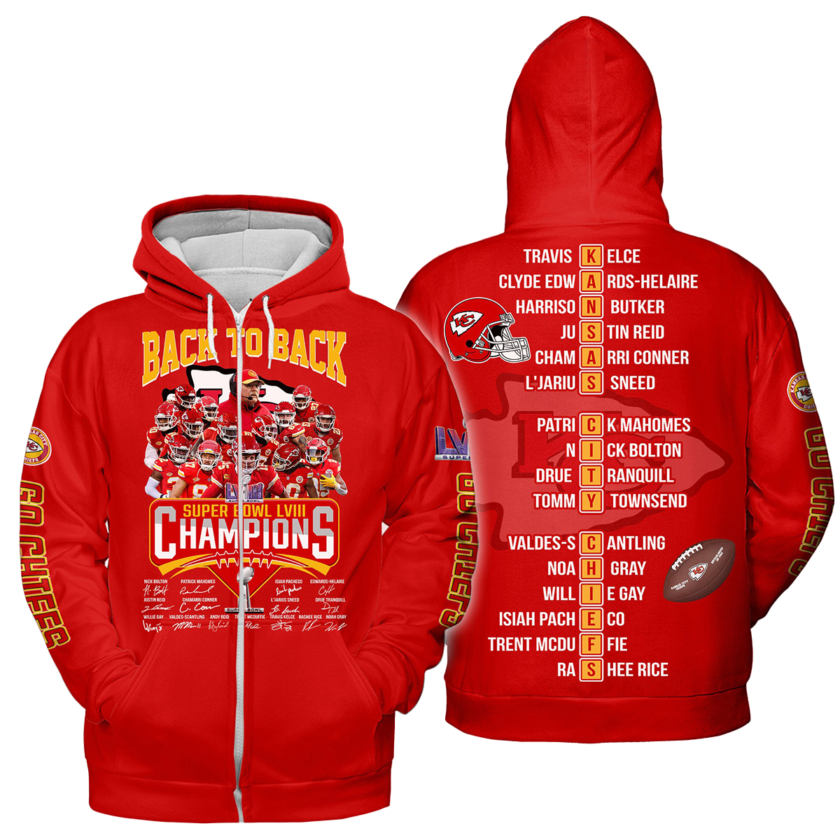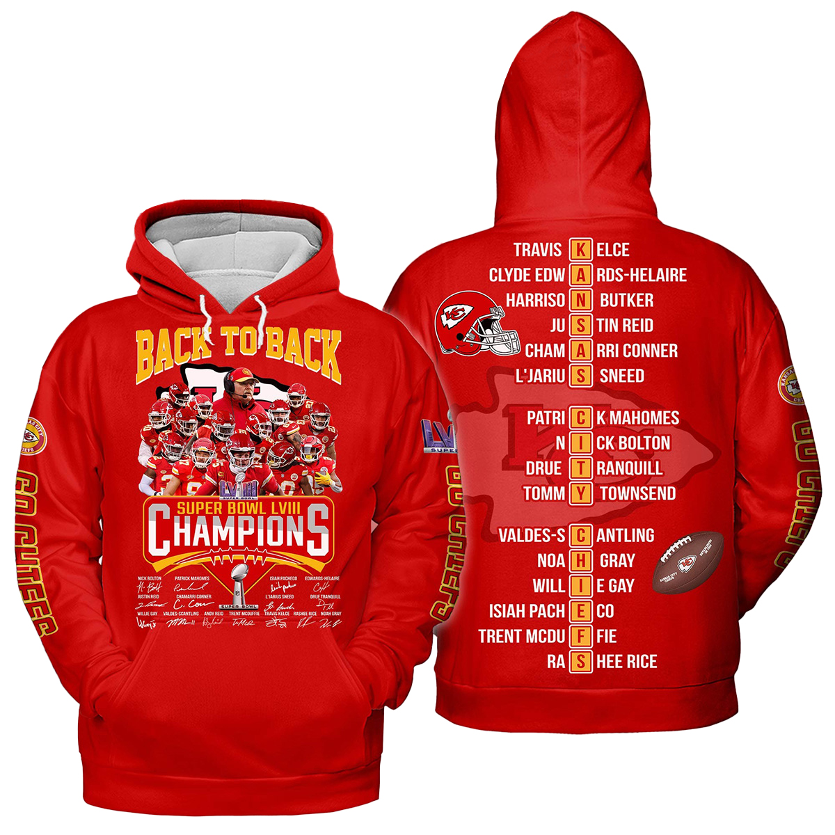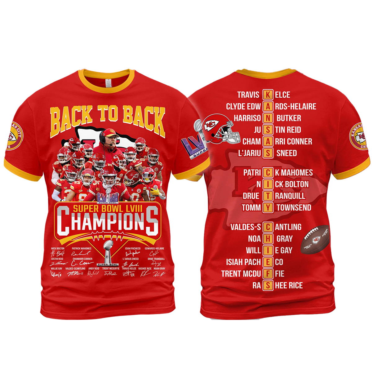Design: Features the bold “Back to Back Super Bowl Champions” graphic in Chiefs colors
