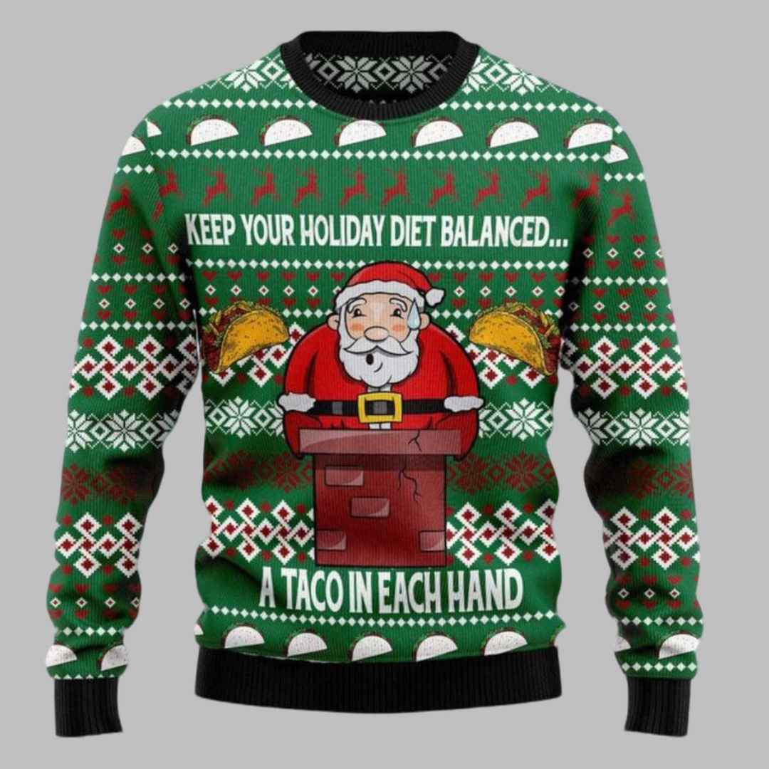 This eye-catching sweater features a cheerful Santa Claus perched on a chimney, holding a taco in each hand. The design incorporates the phrase “Keep Your Holiday Diet Balanced… A Taco in Each Hand,” offering a humorous and relatable take on holiday indulgence. The design is set against a vibrant green backdrop, complemented by festive red and white accents, with classic Christmas patterns like snowflakes and tacos integrated throughout.