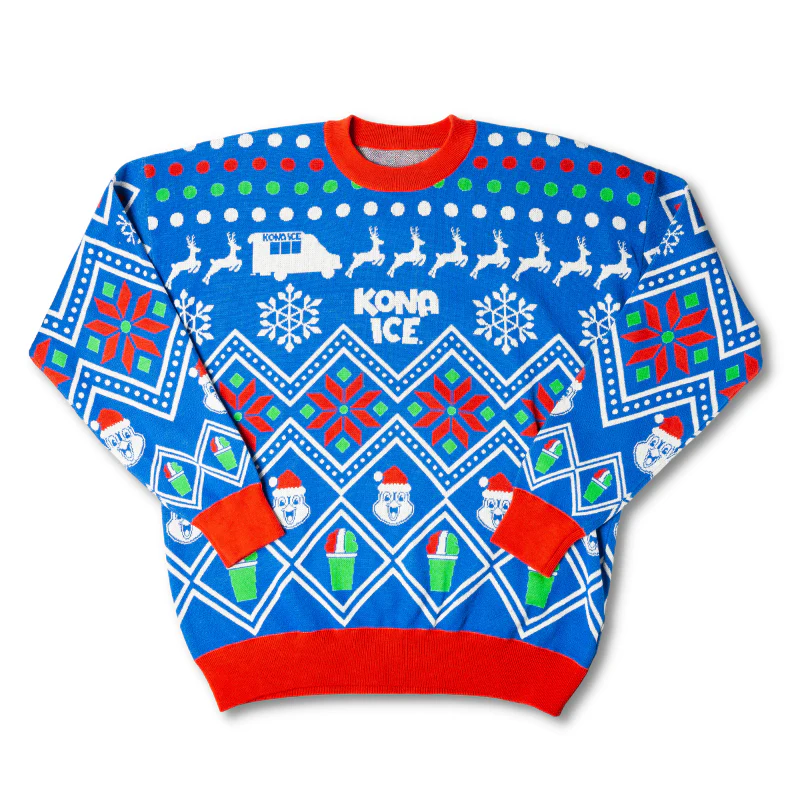 Get into the holiday spirit with a tropical twist in the Kona Ice Ugly Christmas Sweater! Featuring vibrant, festive designs and the fun spirit of Kona Ice, this sweater is perfect for those who want to bring some island flavor to their holiday celebrations. Whether you’re sipping on a snow cone, enjoying a holiday party, or just spreading good vibes, this ugly sweater is a fun way to celebrate the season with a unique, tropical flair.