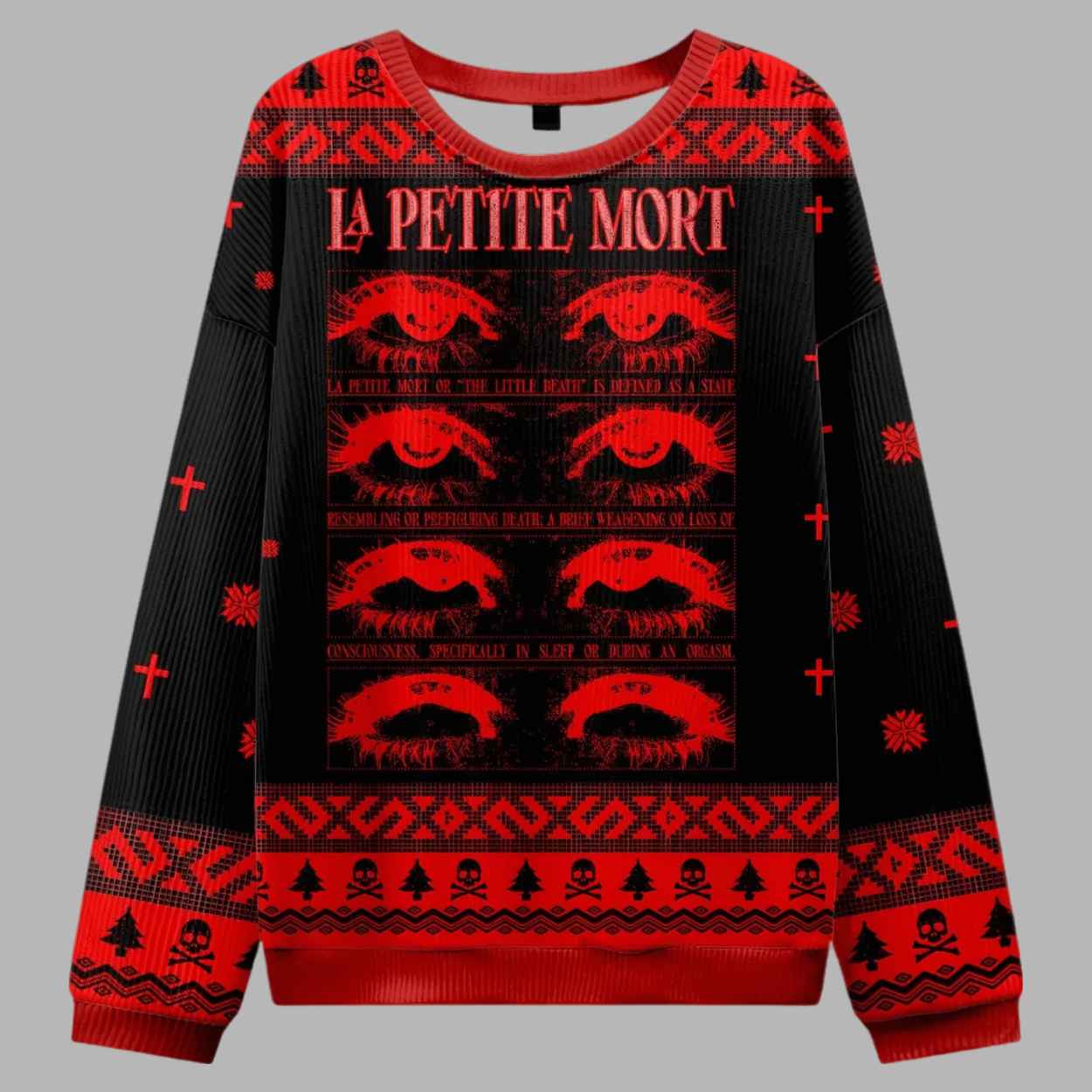 This sweater features a striking black and red color scheme, with traditional ugly Christmas sweater patterns that are anything but ordinary. The sleeves and bottom trim are adorned with skulls, crosses, and Christmas trees, all in a bold red against the black background. The main body of the sweater is where the design truly stands out. At the top, the phrase “LA PETITE MORT” is written in a gothic font, and a series of six unsettling red eyes are depicted below, each with a different, eerie expression. In the center, a description of the phrase “La petite mort” or “the little death” is defined, adding an intellectual and dark layer to the design.