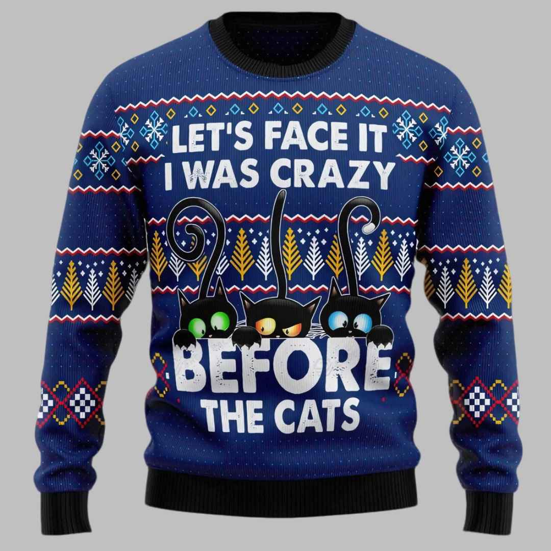 This eye-catching Christmas sweater features a classic ugly Christmas sweater design with a hilarious cat-lover twist. Three mischievous black cats peek out from the bottom, accompanied by the bold statement “Let’s Face It I Was Crazy Before The Cats.” The playful design is accented by festive snowflakes and whimsical patterns, creating a unique and humorous look that any cat lover will adore.