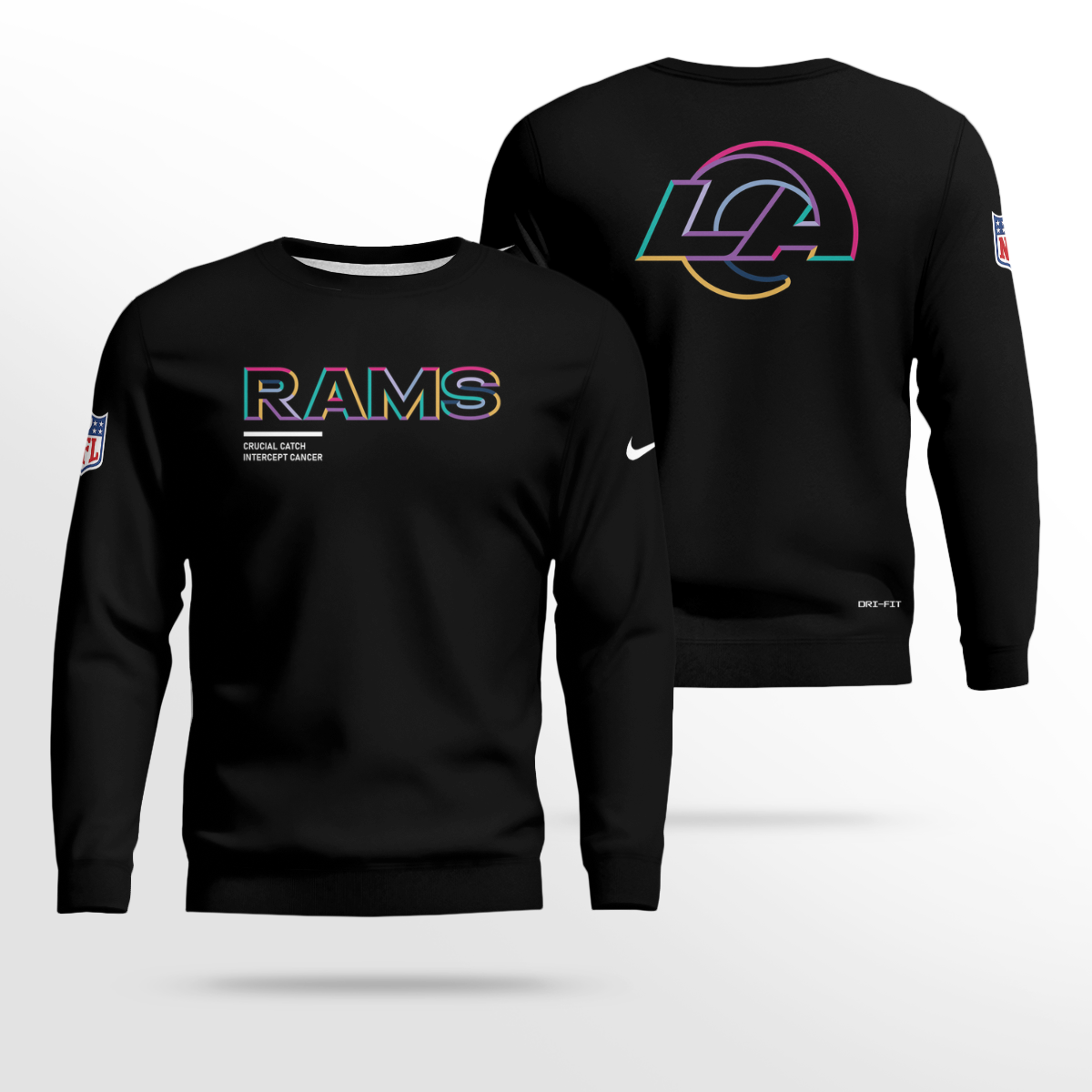 The sleek black design highlights the official Rams logo and Crucial Catch detailing, creating a standout look that balances style and purpose.