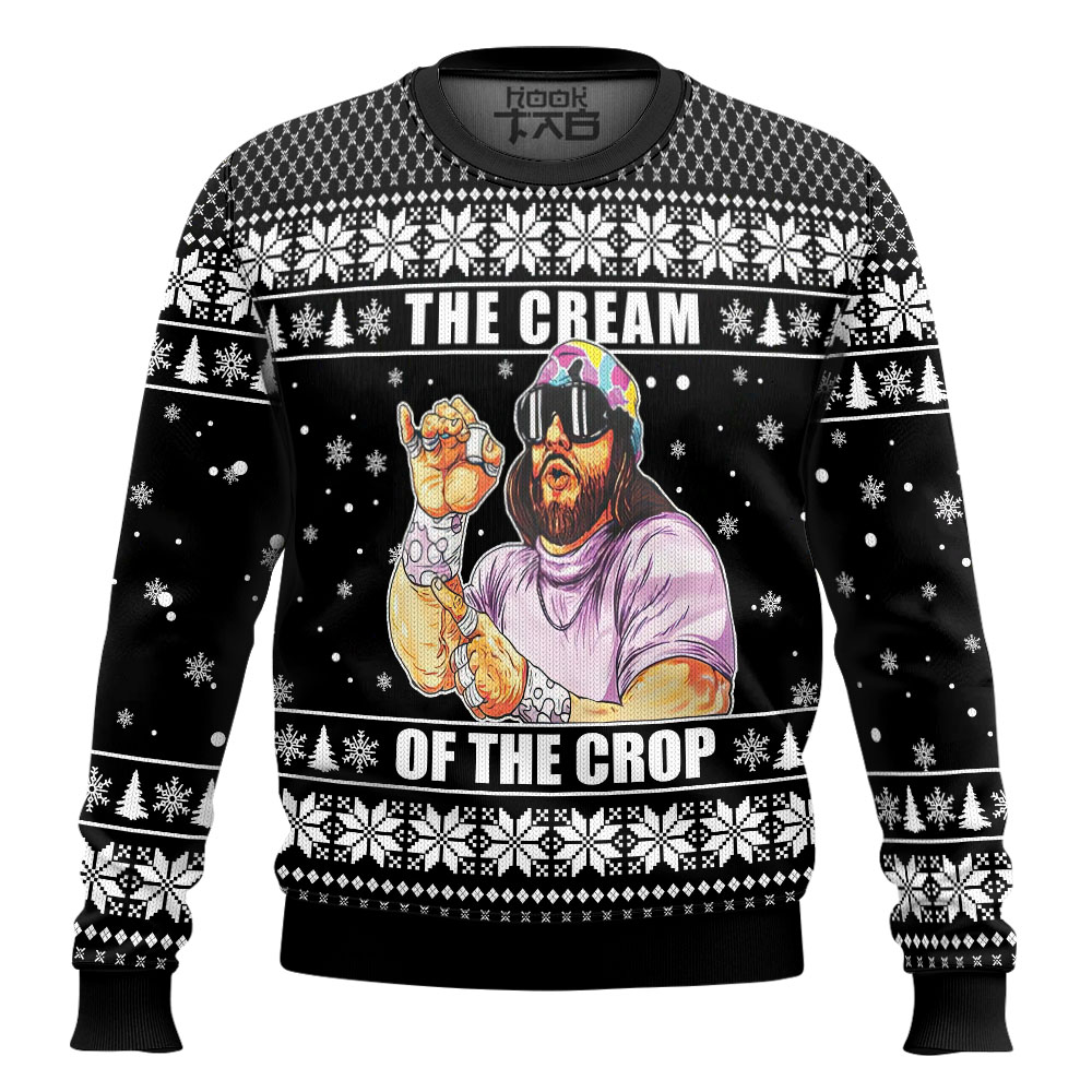 Macho Man Randy Savage The Cream Of The Crop Ugly Sweater This Curvy Glams exclusive Ugly Christmas Sweater design is guaranteed to get attention and get the party started. It?s sure to be your best holiday purchase yet! Material: Our sweaters are made from high-quality polyester wool blend, which keeps you warm and never crack, peel or flake. Features a specialty high definition heat-dye application that ensures long lasting color vibrancy even after machine washing. All our sweaters are handcrafted, cut and sewn one-by-one for the highest quality standard Sizing: Unisex fit. Click on size chart button above add to cart button for addiditional sizing information Care Instructions: Regular handwash; Machine wash (max 40? or 105F); Do not bleach; Iron on a low heat;Tumble dry.