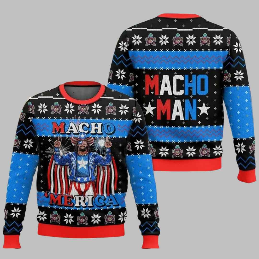 This outrageous sweater features a vibrant design with the legendary wrestler “Macho Man” Randy Savage front and center, decked out in red, white, and blue, with the words “Macho Merica” proudly displayed. The background is adorned with festive snowflakes and stars, adding a touch of Christmas cheer to the patriotic theme. Made from high-quality materials, this sweater is not only comfortable to wear but also built to last. The attention to detail in the design and the bold colors make this sweater a guaranteed head-turner at any holiday gathering.