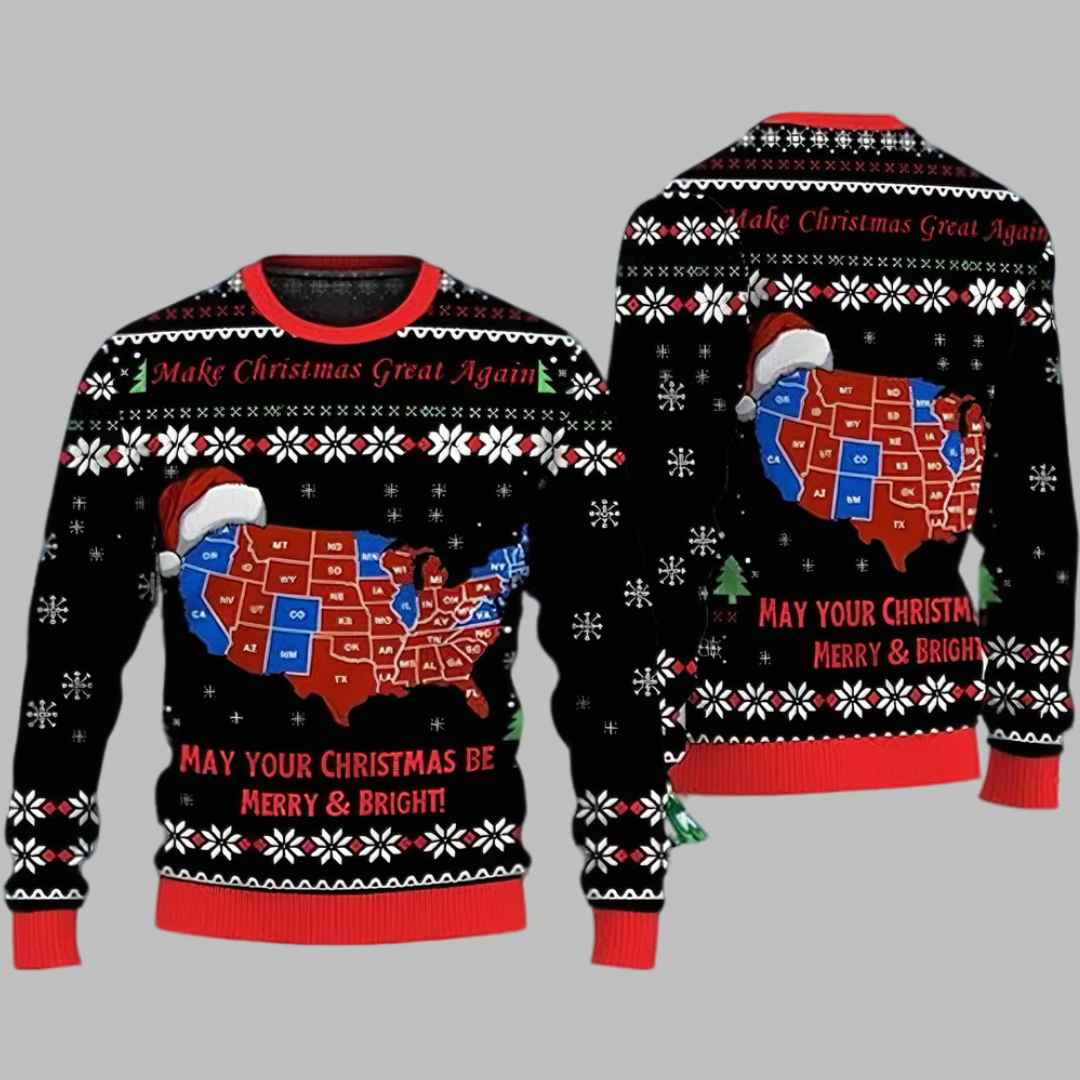 The Make Christmas Great Again Ugly Christmas Sweater features a striking design with a map of the United States in festive red and blue, topped with a Santa hat. The phrase “Make Christmas Great Again” adds a playful touch, while the message “May Your Christmas Be Merry & Bright!” conveys warm holiday wishes. This eye-catching sweater is sure to spark conversations and make a statement at any Christmas gathering.