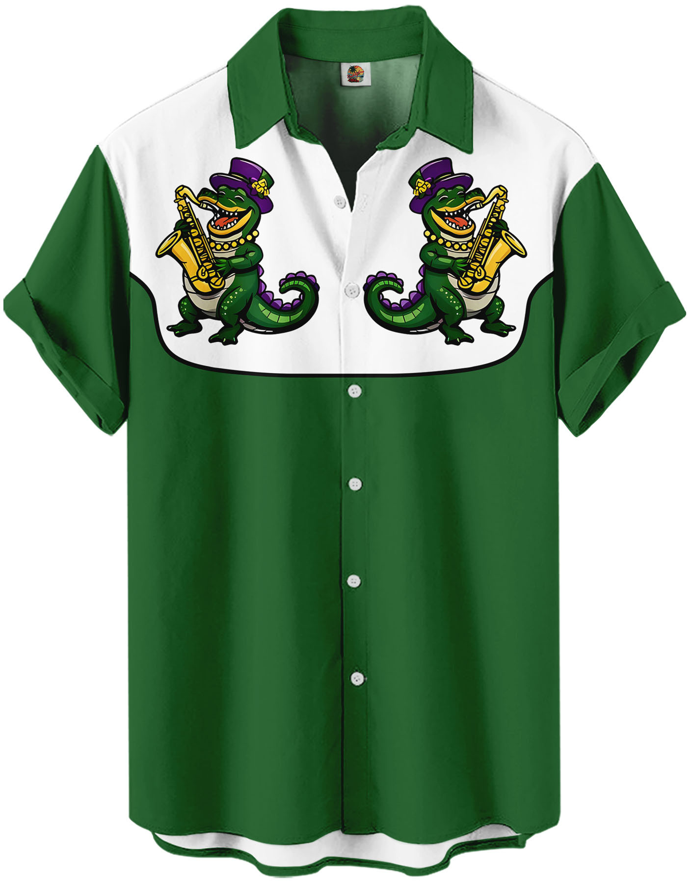 Unisex Mardi Gras Jazz Alligator Button Down Shirt, Short Sleeve, Green and White Western Style