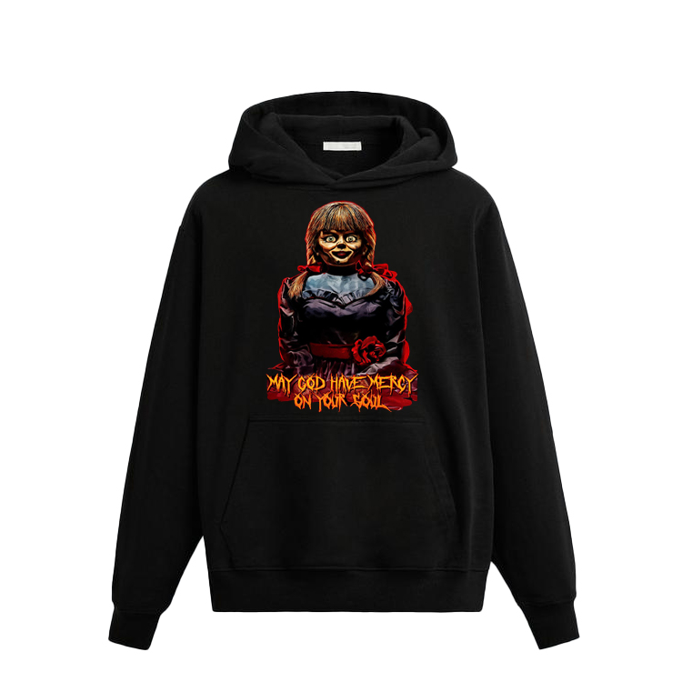 Step into the world of fear with the Annabelle “May God Have Mercy On Your Soul” T-Shirt. Inspired by the iconic horror movie doll, this shirt captures the chilling essence of Annabelle’s dark power — a perfect piece for horror fans who love a thrill with their fashion.