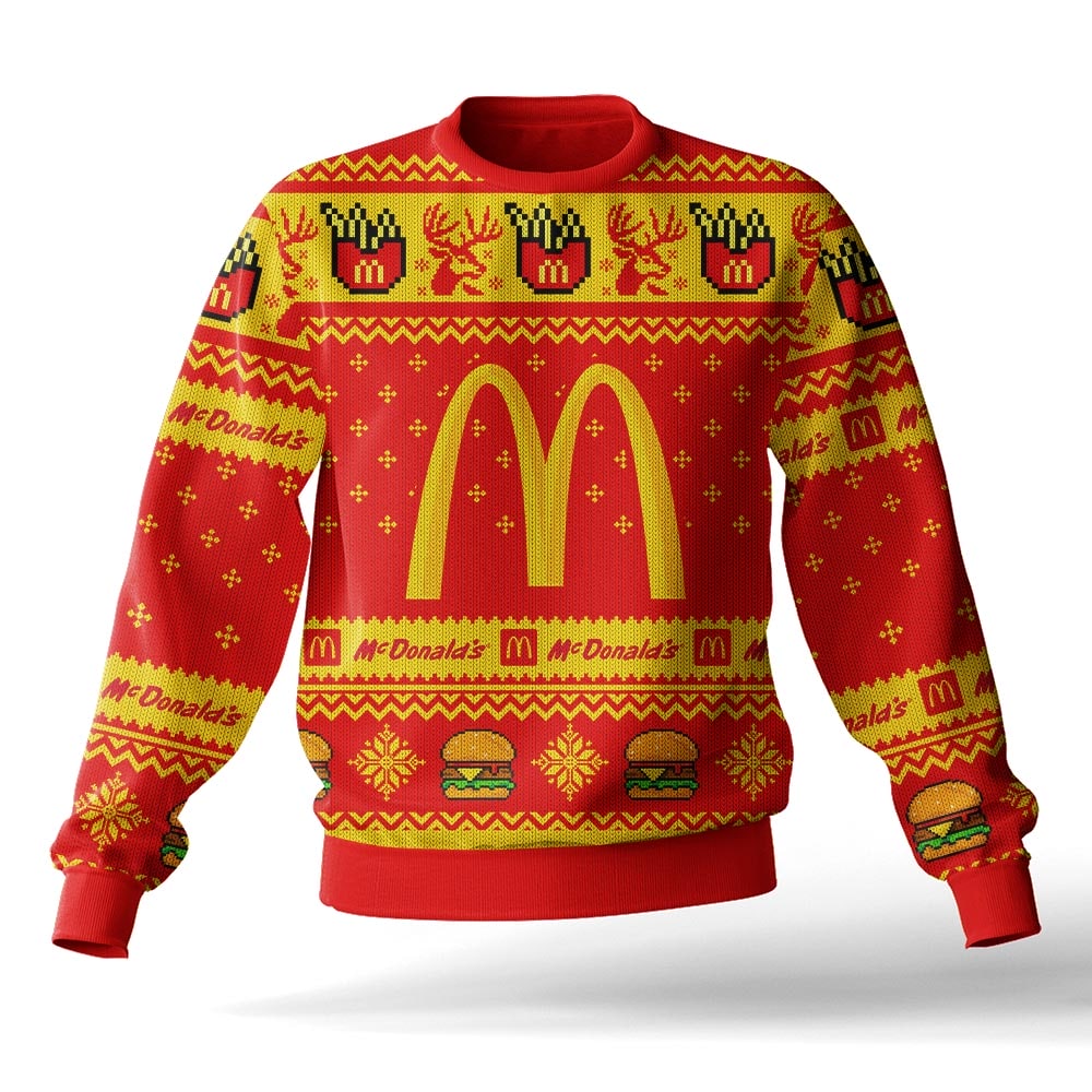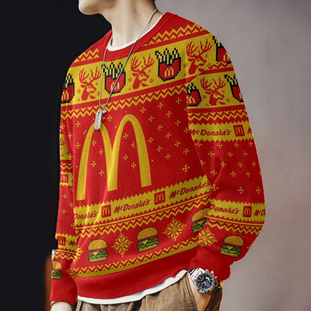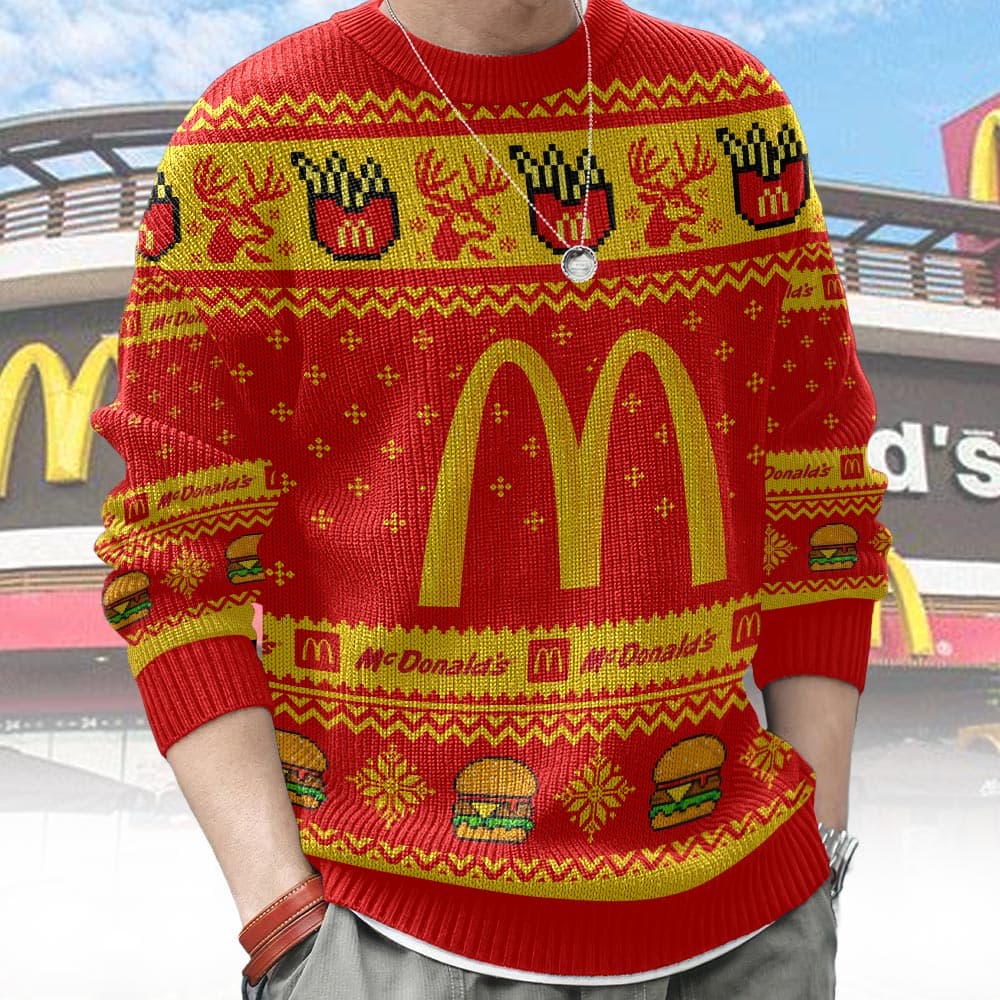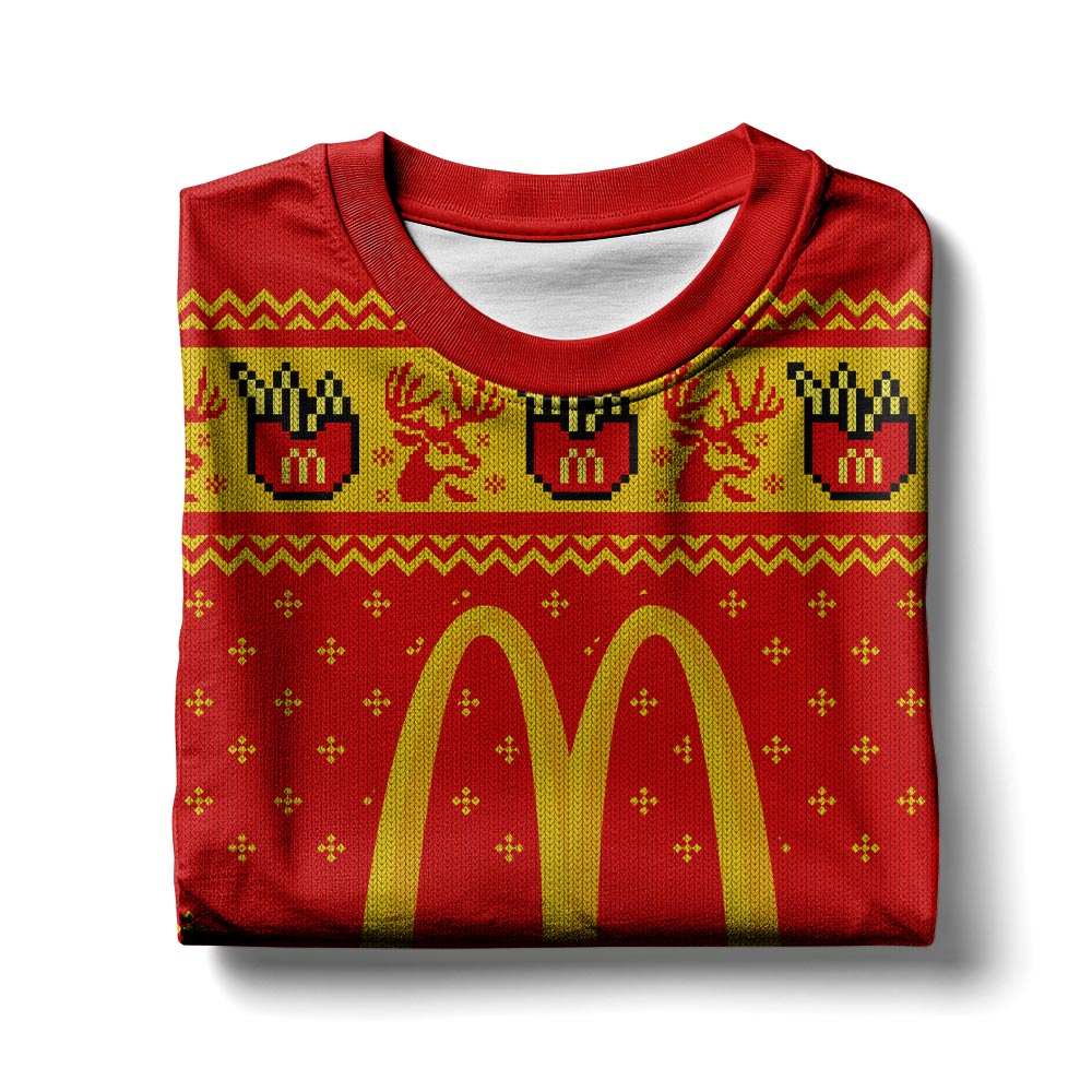 McDonald’s Ugly Sweater This Curvy Glams exclusive Ugly Christmas Sweater design is guaranteed to get attention and get the party started. It?s sure to be your best holiday purchase yet! Material: Our sweaters are made from high-quality polyester wool blend, which keeps you warm and never crack, peel or flake. Features a specialty high definition heat-dye application that ensures long lasting color vibrancy even after machine washing. All our sweaters are handcrafted, cut and sewn one-by-one for the highest quality standard Sizing: Unisex fit. Click on size chart button above add to cart button for addiditional sizing information Care Instructions: Regular handwash; Machine wash (max 40? or 105F); Do not bleach; Iron on a low heat;Tumble dry.