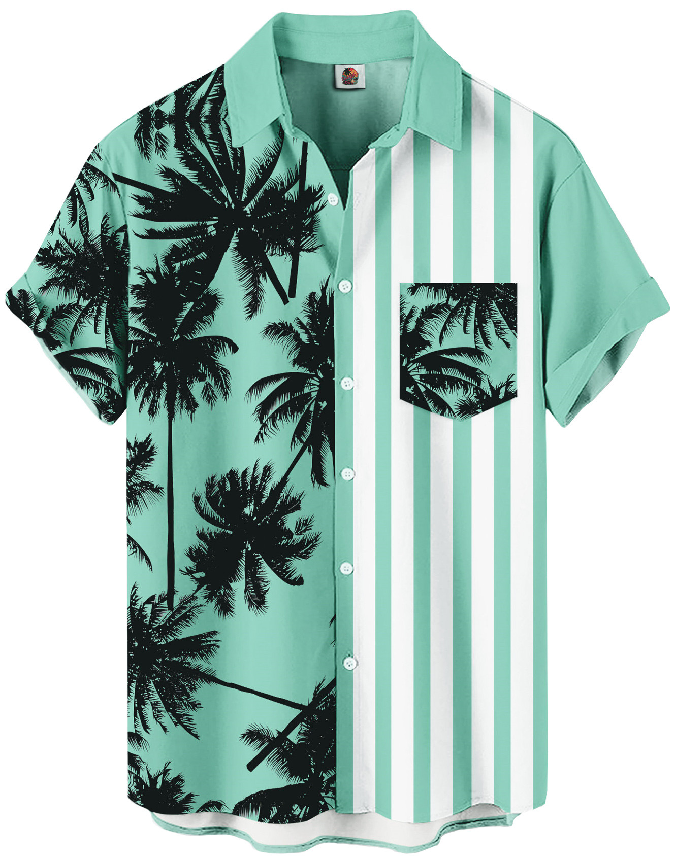 Mint Green Hawaiian Shirt – Palm Tree Print, Striped Short Sleeve Button Down