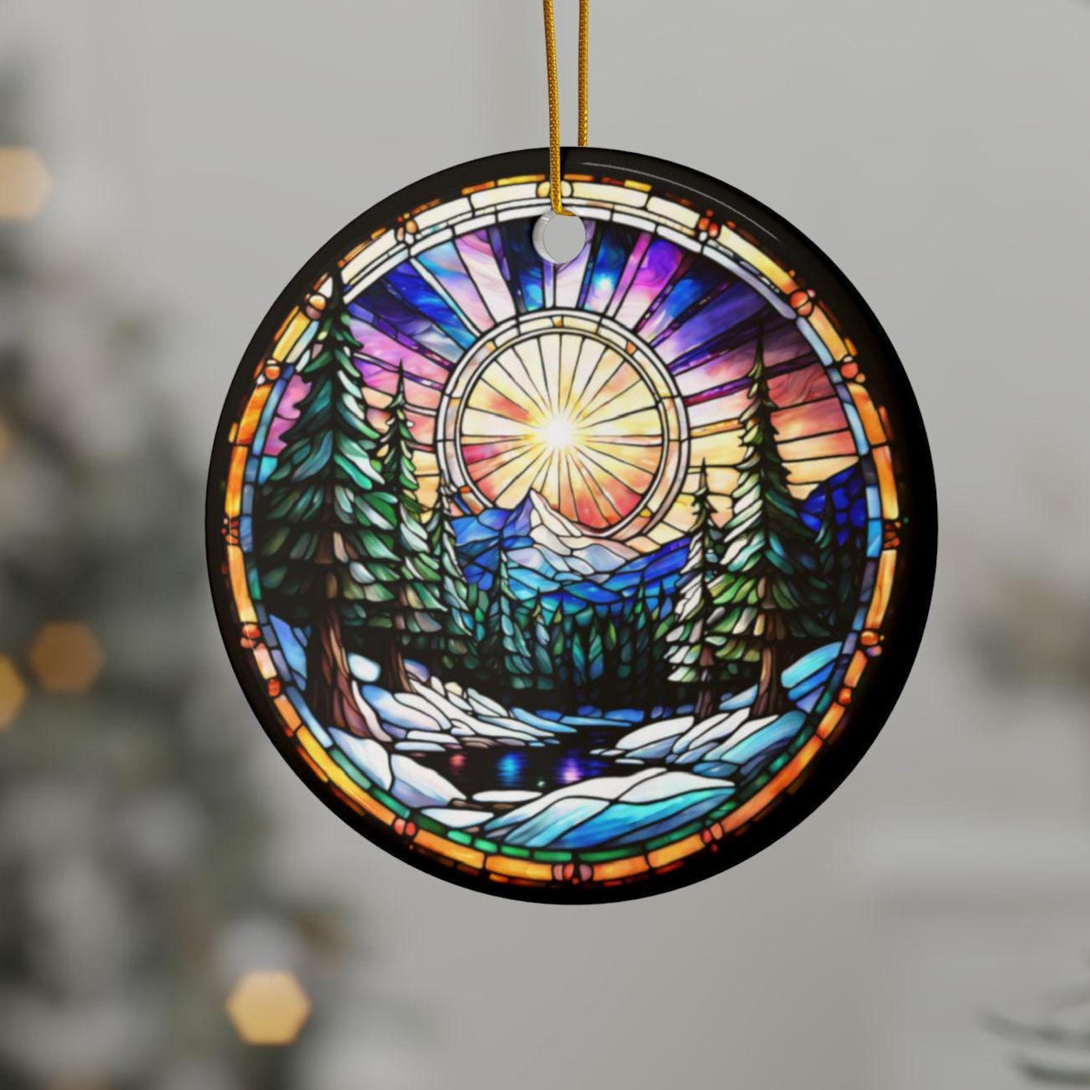 Mountain Sunrise Forest Stained Glass look Ceramic Ornaments, 2-Side Print, Winter Scene Snow, nature lover ornament, naturecore christmas