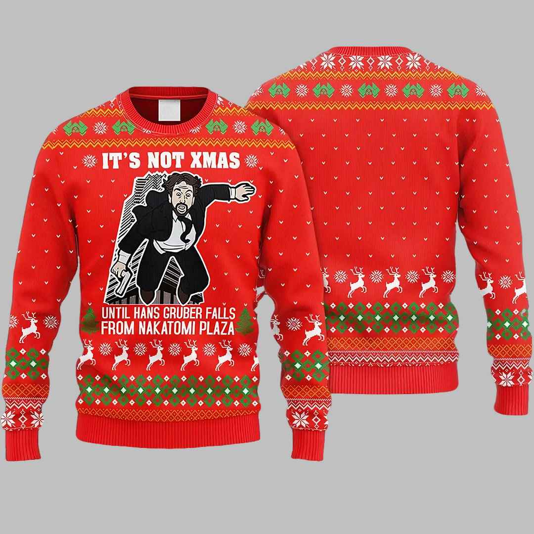 This eye-catching knitted sweater features a classic ugly Christmas sweater design with a Die Hard twist. The front showcases Hans Gruber’s unforgettable fall from Nakatomi Plaza, accompanied by the phrase “It’s Not Xmas Until Hans Gruber Falls From Nakatomi Plaza.” The back features a festive pattern of snowflakes and reindeer, adding a touch of holiday spirit to the action-packed design. Made from high-quality materials, this sweater is not only visually stunning but also warm and comfortable for those chilly winter days.