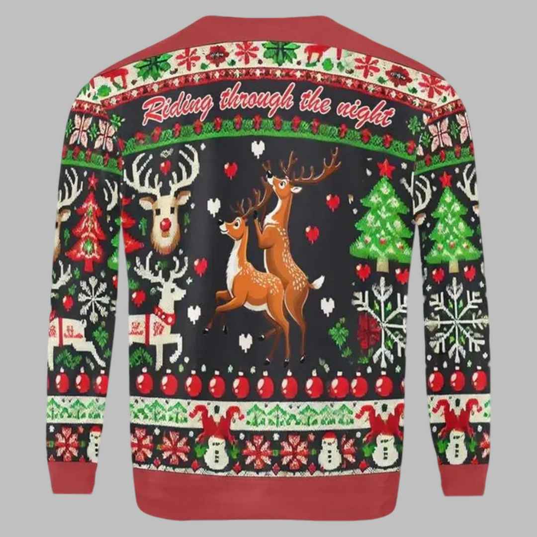 This eye-catching sweater features a hilarious design of two reindeer getting up to some “adult” reindeer games against a backdrop of classic Christmas motifs. The intricate details include snowflakes, Christmas trees, presents, and snowmen, all woven into a festive tapestry of red, green, and white on a black background. The sweater is made from quality, soft-knit fabric that’s comfortable to wear and perfect for those chilly winter nights. Available in a range of sizes to ensure the perfect fit, this sweater is a must-have for anyone who wants to stand out from the crowd and embrace the lighthearted spirit of Christmas.