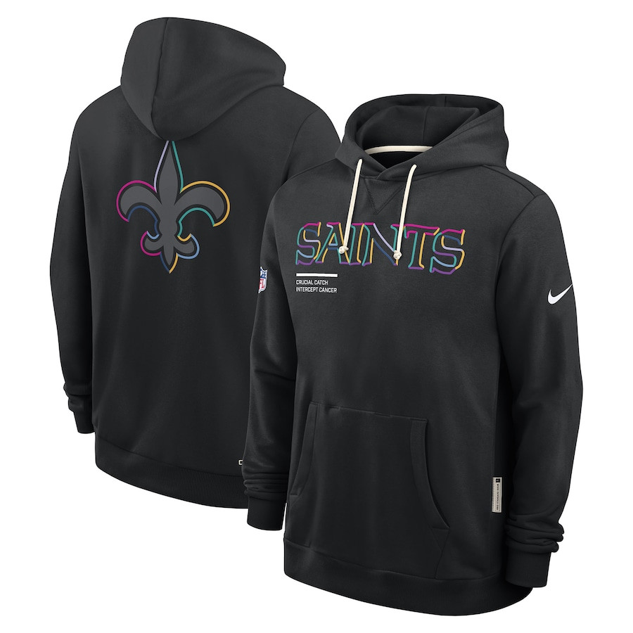 Stand united with the New Orleans Saints Black 2025 Crucial Catch Sideline Standard Issue Hoodie, a bold piece that blends team pride with a powerful cause. Worn by players and staff on the sidelines, this hoodie is more than game-day apparel — it’s a statement of support in the fight against cancer.
