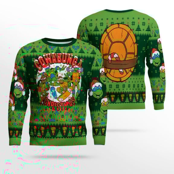 Cowabunga! Get ready to celebrate the holidays in true turtle style with the Ninja Turtles Cowabunga Ugly Christmas Sweater! This festive sweater brings together the fun, action, and pizza-loving spirit of the Teenage Mutant Ninja Turtles with the joy of the holiday season. Featuring the Turtles in their classic, heroic poses, it’s the perfect way to rock your holiday parties with a dash of mutant power and Christmas cheer.