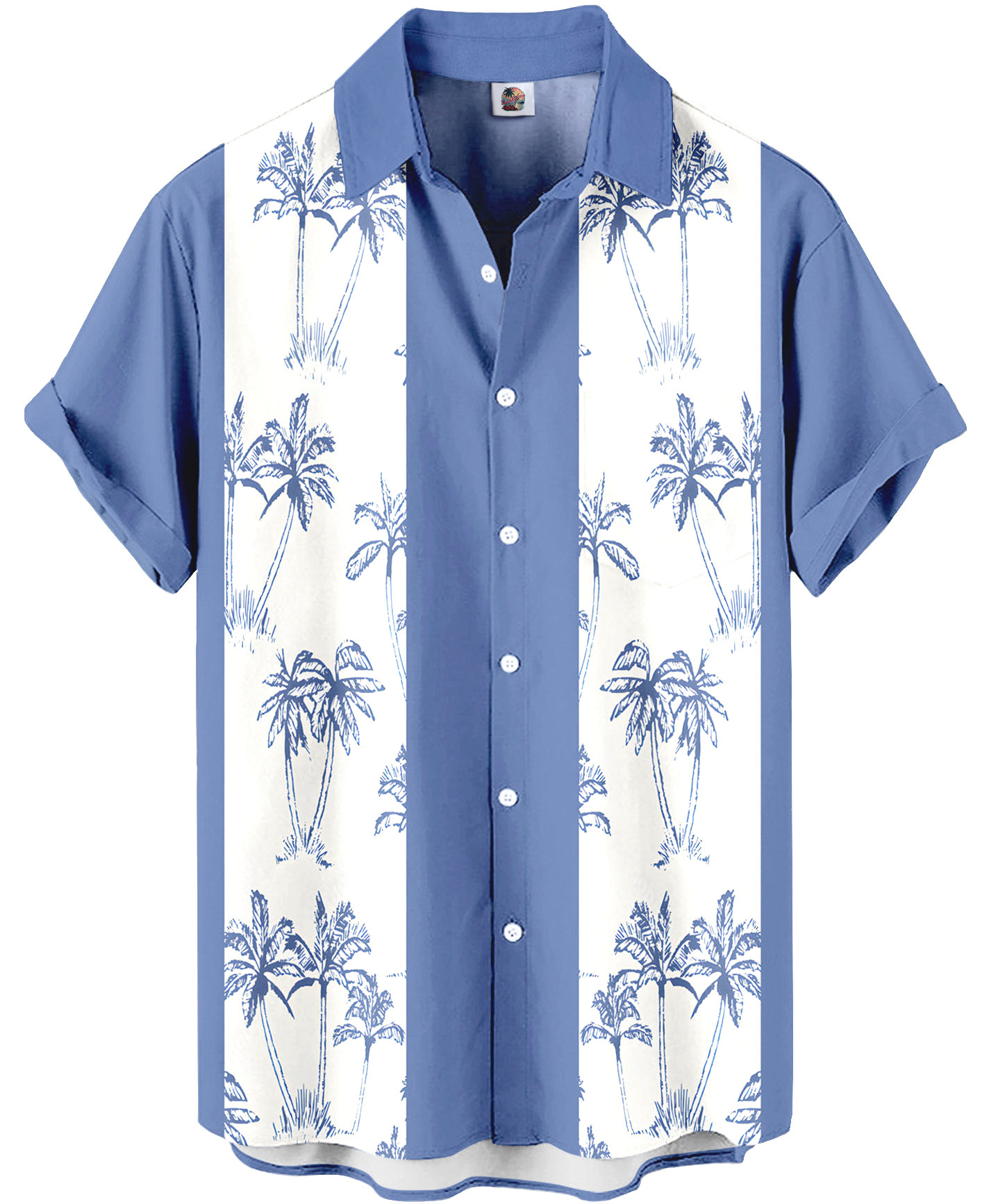 Unisex Hawaiian Palm Tree Print Button Down Shirt – Short Sleeve, Blue & White