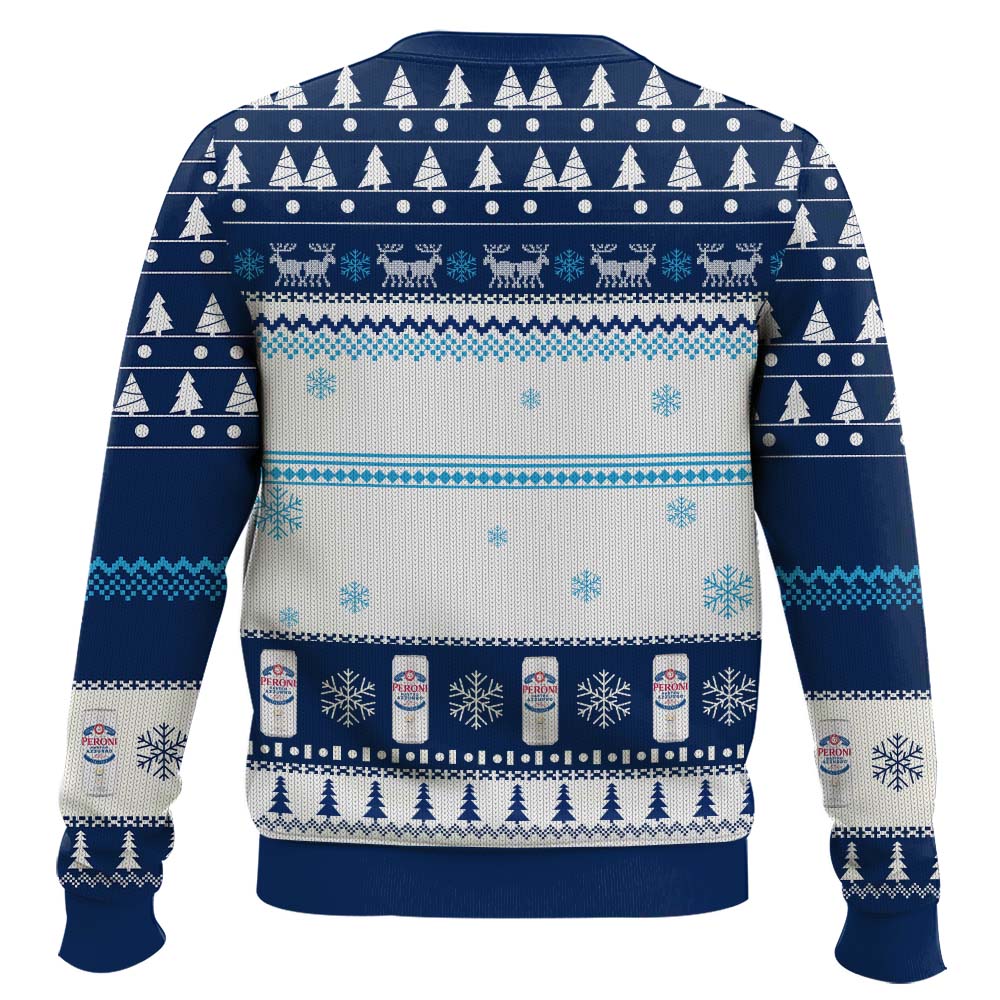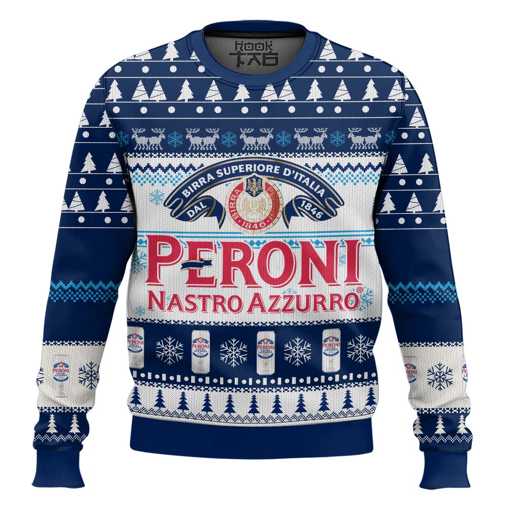 Peroni Nastro Azzurro Ugly Christmas Sweater This Curvy Glams exclusive Ugly Christmas Sweater design is guaranteed to get attention and get the party started. It?s sure to be your best holiday purchase yet! Material: Our sweaters are made from high-quality polyester wool blend, which keeps you warm and never crack, peel or flake. Features a specialty high definition heat-dye application that ensures long lasting color vibrancy even after machine washing. All our sweaters are handcrafted, cut and sewn one-by-one for the highest quality standard Sizing: Unisex fit. Click on size chart button above add to cart button for addiditional sizing information Care Instructions: Regular handwash; Machine wash (max 40? or 105F); Do not bleach; Iron on a low heat;Tumble dry.