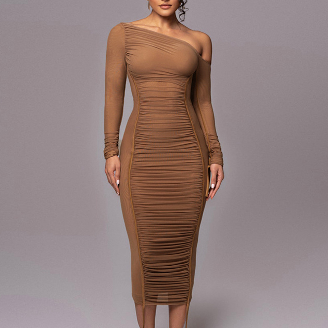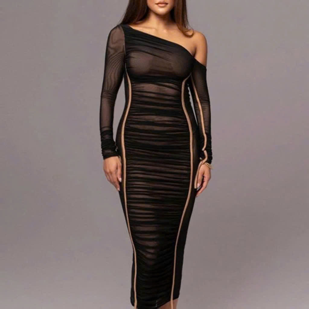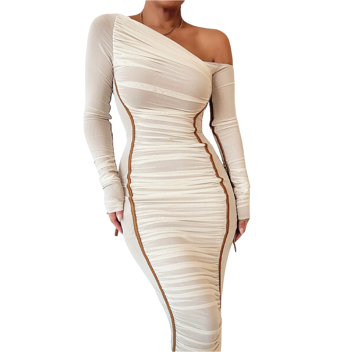 Plus Size Women's Pleated Midi Dress with Mesh Splicing and Off-Shoulder Design