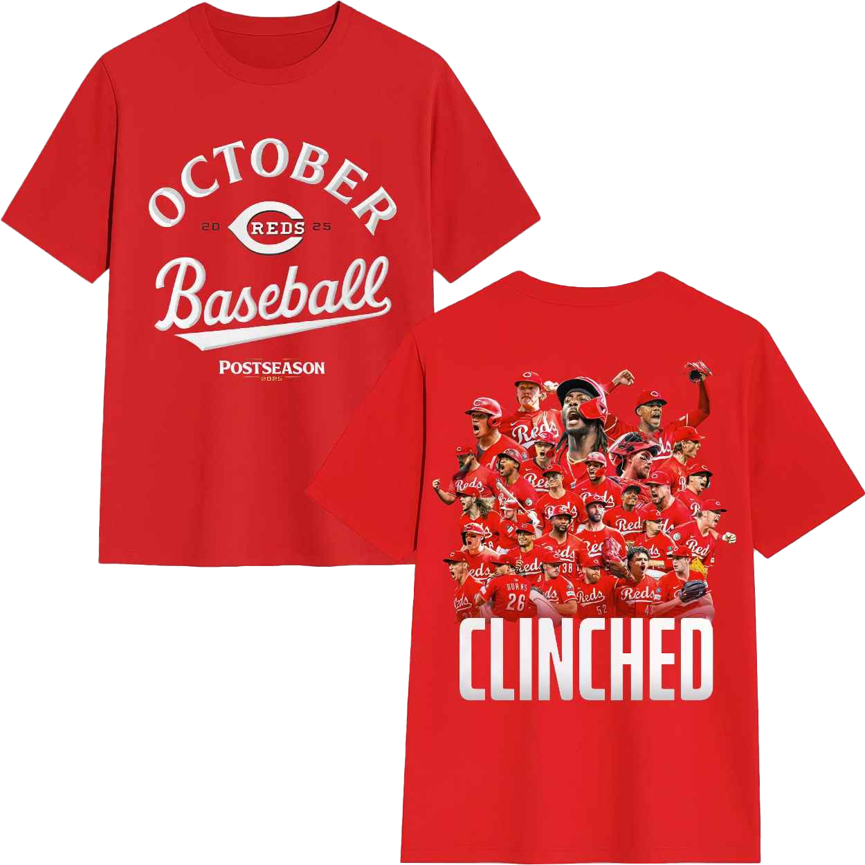 Celebrate a moment of triumph and anticipation with the Reds 2025 October Baseball Clinched T-Shirt! This shirt commemorates the Reds’ hard-fought journey to clinching a postseason spot in 2025, marking the beginning of a thrilling October filled with playoff baseball. Featuring a bold graphic, it’s the perfect way to honor the team’s achievement and showcase your pride as the Reds gear up for October glory.
