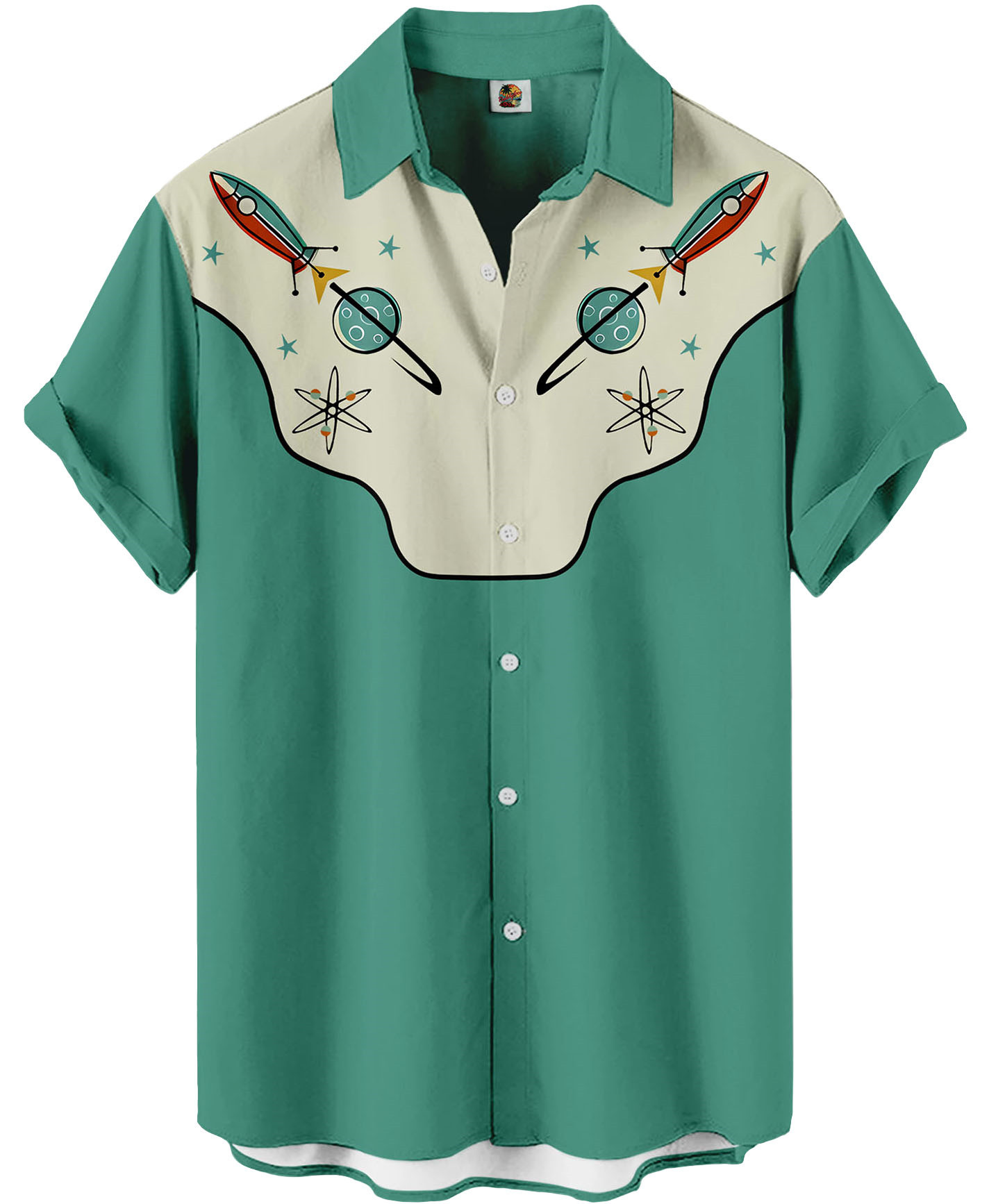 Rocket Print Hawaiian Shirt – Mint Green Retro Space Age Western Style