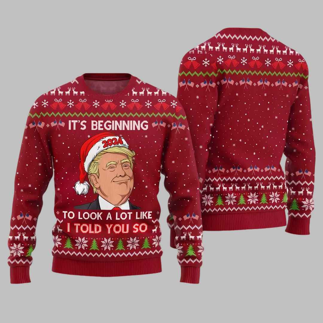 The Santa Trump It?s Beginning To Look A Lot Like I Told You So Ugly Christmas Sweater brings humor and festive spirit to your holiday wardrobe. Set against a classic red background adorned with traditional Christmas elements like snowflakes, reindeer, and Christmas trees, the sweater also features small American flags for a patriotic touch. The centerpiece of the design is a caricature of Trump in a Santa hat labeled ?2024,? with the bold phrase, ?It?s Beginning To Look A Lot Like I Told You So,? giving the sweater a humorous, nostalgic twist. Crafted from soft, cozy fabric, this sweater offers warmth and comfort, making it perfect for any holiday gathering. The ribbed cuffs, neckline, and hem ensure a snug, comfortable fit, allowing you to celebrate in style.