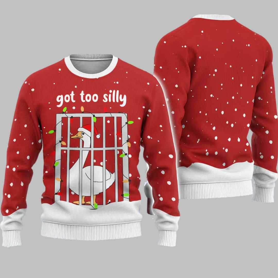 The Silly Goose Christmas Ugly Christmas Sweater features a playful design with the infamous goose sporting a Santa hat and confined to a cage adorned with Christmas lights, accompanied by the phrase “got too silly”. This quirky and humorous sweater is guaranteed to bring smiles and laughter to any holiday gathering.