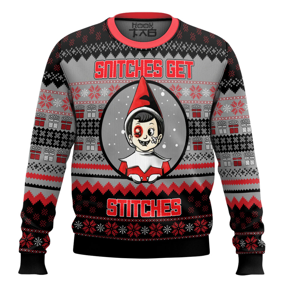 SNITCHES GET STITCHES Christmas Sweater This Curvy Glams exclusive Ugly Christmas Sweater design is guaranteed to get attention and get the party started. It?s sure to be your best holiday purchase yet! Material: Our sweaters are made from high-quality polyester wool blend, which keeps you warm and never crack, peel or flake. Features a specialty high definition heat-dye application that ensures long lasting color vibrancy even after machine washing. All our sweaters are handcrafted, cut and sewn one-by-one for the highest quality standard Sizing: Unisex fit. Click on size chart button above add to cart button for addiditional sizing information Care Instructions: Regular handwash; Machine wash (max 40? or 105F); Do not bleach; Iron on a low heat;Tumble dry.