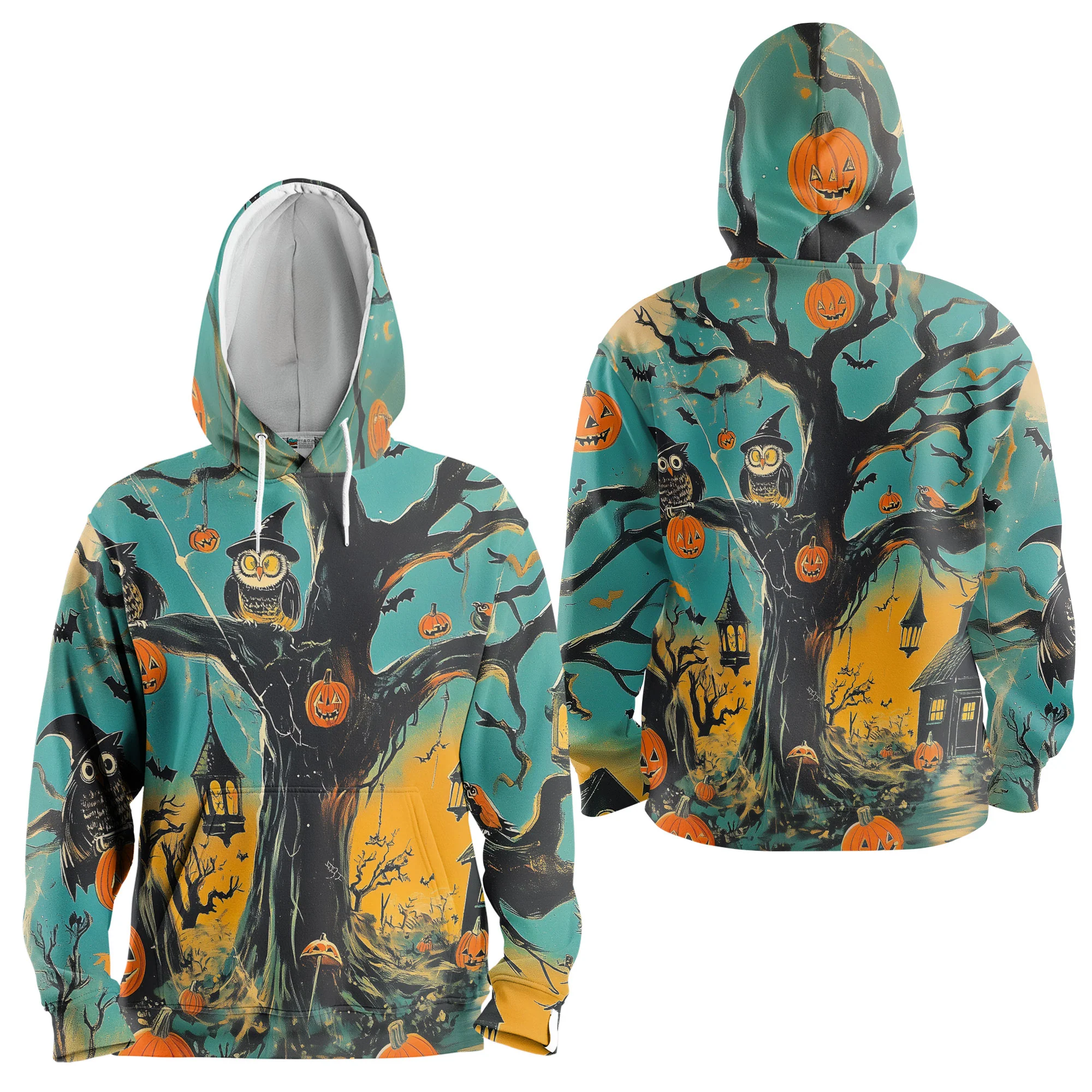 Featuring mischievous ghosts floating around smiling pumpkins, this hoodie delivers a playful, spooky vibe perfect for Halloween enthusiasts of all ages.